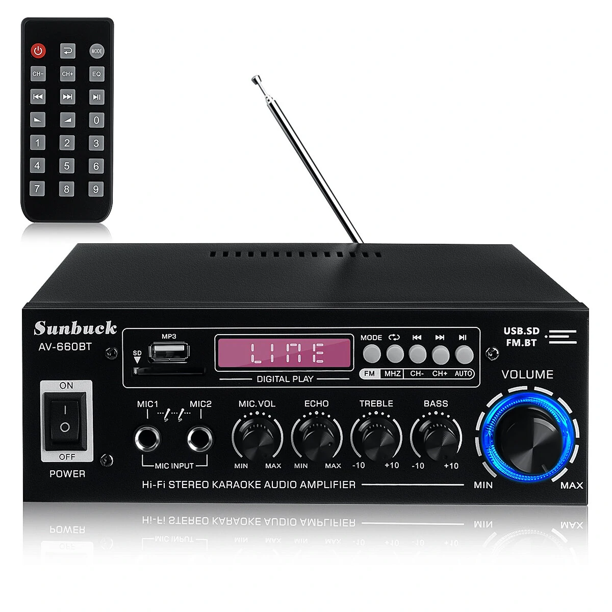 انقر لدليل المستخدم المميزات:1. مجموعة من المكبرات هي مكبر صوت مناسب لحفلة صغيرة2. مدخلات إشارة اثنان: إشارة دي في دي وإشارة AUX3. تحويل الطاقة 115 فولت / 230 فولت4. مع التحكم عن بعد5. بلوتوث 5.06. مع راديو FM7. مختلط EQ من 5 فرقة8. تردد، ضبط دقيق، توازن9. واجهة SD و USB ، مدخلان للميكروفون.10. Wضبط الصدى والتأخير مع الميكروفون المواصفات:Model AV-660BTحجم 200*70*190mm/7.9x2.8x7.5"الجهد تحويل 115 فولت/230 فولت، DC12 فولتالطاقة المقدرة 1200Wذروة 2000Wالتردد المقيّم 20KH - 20KHzنسبة الإشارة إلى الضوضاء 90 ديسيبلالمعاوقة القياسية 4 إلى 16 أومنوع مضخم الطاقة مضخم طاقة AVقناة قناة 2.0تشوه كلي للتوافق الهارموني حساسية إشارة الإدخال 200mv (± 30mv)حساسية مدخل الميكروفون 9 مللي فولت (± 2 مللي فولت)مخرج مستوى التسجيل 1Vالإخراج على مستوى المساعدة 1Vالدعمقرص USB/بطاقة SD سعة 64 جيجابايت كحد أقصى (غير مشمولة)لون أسود، أبيض ملاحظة:لا يتم تضمين قرص USB / بطاقة SD سعة 64 جيجابايت كحد أقصى في الحزمة2. يرجى السماح بفروقات تصل إلى 0.5-1 سم بسبب القياس اليدوي.3. بسبب اختلاف الضوء والشاشة ، قد يكون لون العنصر مختلفًا قليلاً عن الصور. تم تضمينه في العبوة:1 X مضخم صوتي1 X جهاز تحكم عن بعد1 X دليل المستخدم