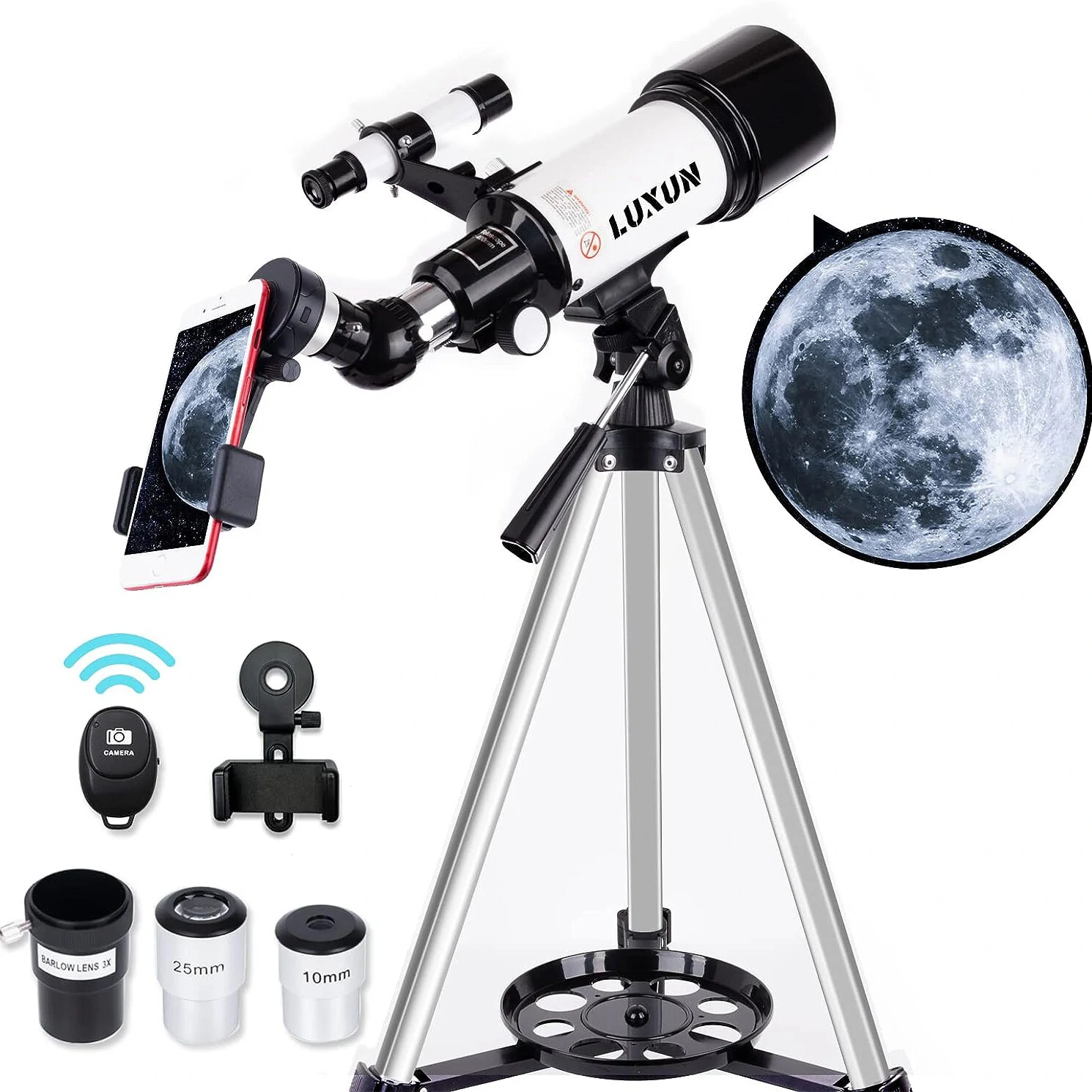 사양: 모델40070제품명망원경 천문학아이피스 광도70mm확대16X/40X초점 거리400mm선형 시야61ft출구 동공2.2mm해상도 비율≤4.0mm빛의 힘 수집73.5X사이트 각도1.3°무게3kg패키지 크기65*15*25 cm 특징:고화질 광학: 400mm의 초점거리 (f/5.7)와 70mm의 조리개, 완전 코팅된 광학 유리 렌즈는 높은 투과성 코팅으로 멋진 이미지를 만들어내고 눈을 보호합니다. 별과 달을 탐색하는 완벽한 망원경입니다.2.배율: 두 개의 교체 가능한 아이피스와 3배 바를로 렌즈가 함께 제공됩니다. 3배 바를로 렌즈는 각 아이피스의 배율을 세 배로 증가시킵니다. 장착용 홀더와 내부에 십자가 선이 있는 5배 24 조감경은 물체를 쉽게 찾을 수 있게 해줍니다.3. 무선 원격 제어: 무료로 스마트폰 어댑터 하나와 무선 카메라 원격 제어기 하나가 포함되어 있어 화면을 통해 세계의 자연을 손쉽게 탐색하고 놀라운 천문 사진을 찍을 수 있습니다.4.조절 가능한 삼각대: 조절 가능한 알루미늄 합금 삼각대와 휴대용 가방으로 다양한 관람 위치가 가능한 이 망원경은 여행과 보관을 위해 망원경과 삼각대를 가방 안에 넣을 수 있습니다.패키지에 포함되어 있는 것:1 x 망원경 튜브1 x 파인더 스코프1 x 스마트폰 클립1 x 블루투스 무선 리모컨1 x 삼각대1 x 트레이1 x 1.25" PL25mm 아이피스1 x 1.25" PL10mm 아이피스1 x 3X 바를로우 렌즈1 x 특별 디자인된 나일론 쌍안경 가방1 x 사용자 매뉴얼