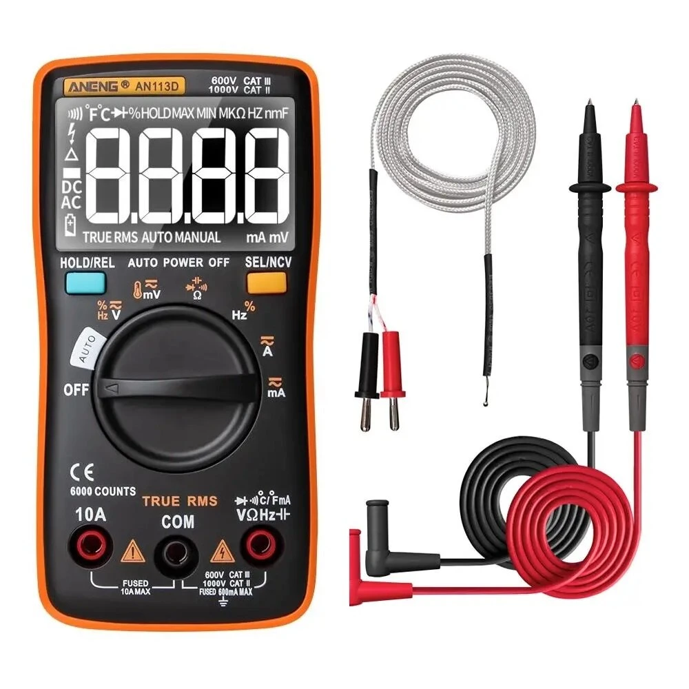 Özellikler:Bu ürün çok fonksiyonlu. otomatik aralık 6000 sayım LCD ekranlı dijital multimetre. Ölçüm fonksiyonları arasında AC / DC voltaj, AC / DC akım, direnç, diyot testi/devamlılık, NCV, frekans / görev döngüsü, kapasitans yer alır. 2. True- RMS desteği 3. Otomatik Kapanma Desteği 4. Sıcaklık ölçümünü destekle 5. Veri tutma desteği Özellikler:Ekran (LCD): 6000 sayımAralık: Otomatik Malzeme: ABS/PVCRenk: TuruncuGüncelleme Hızı: 3 kez / saniyeDüşük Pil Göstergesi: √Ürün Ağırlığı: 114g (piller dahil değildir)Ürün Boyutu: 130*65*32mmÇalışma Sıcaklığı: 0~40℃ Nem İşletme Depolama: Sıcaklık -20 ~ 60℃ Nem DC Gerilim: 6,000 V (0,001V) / 60,00V (0,01V) / 600,0V (0,1V) / 1000V (1V) ± (0,5% + 3)DC Gerilim: 60,00mV (0,01mV)/ 600mV (0,1mV) ±(0,5%+3) AC Gerilim: 6.000V (0.001V) / 60.00V (0.01V)/ 600.0V (0.1V)/ 750V (1V ) ±(1.0%+3) AC Gerilim: 60.00mV (0.01mV) / 600.0mV (0.1mV) ±(1.0%+3) DC Akımı: 6.000A (0.001A) / 10.00A (0.01A) ± (1.2% + 3) DC Akım: 60,00mA (0,01mA)/600,0mA (0,1mA) AC Akımı: 6.000A (0.001A) / 10.00A (0.01A) ± (1.5%+3)AC Akımı: 60.00mA (0.01mA) / 600.0mA (0.1mA) ±(1.5%+3)Direnç: 600,0Ω (0,1Ω) / 6,000kΩ (0,001kΩ) / 60,00kΩ (0,01kΩ) / 600,0kΩ (0,1kΩ) / 6,000MΩ (0,001MΩ) ± (0,5% +3) / 60,00MΩ (0,01MΩ) ± (1,5% +3) Kapasitans: 9.999nF (0.001nF) ± (5.0% +20) /99.99nF (0.01nF) 999.9nF (0.1nF) / 9.999μF (0.001μF) / 99.99μF (0.01μF) / 999.9μF (0.1μF) ± (2.0% +5) / 9.999mF (0.001mF) ± (5.0% +5) Frekans: 99.99Hz (0.01Hz) / 999.9Hz (0.1Hz) / 9.999kHz (0.001kHz) / 99.99kHz (0.01kHz)