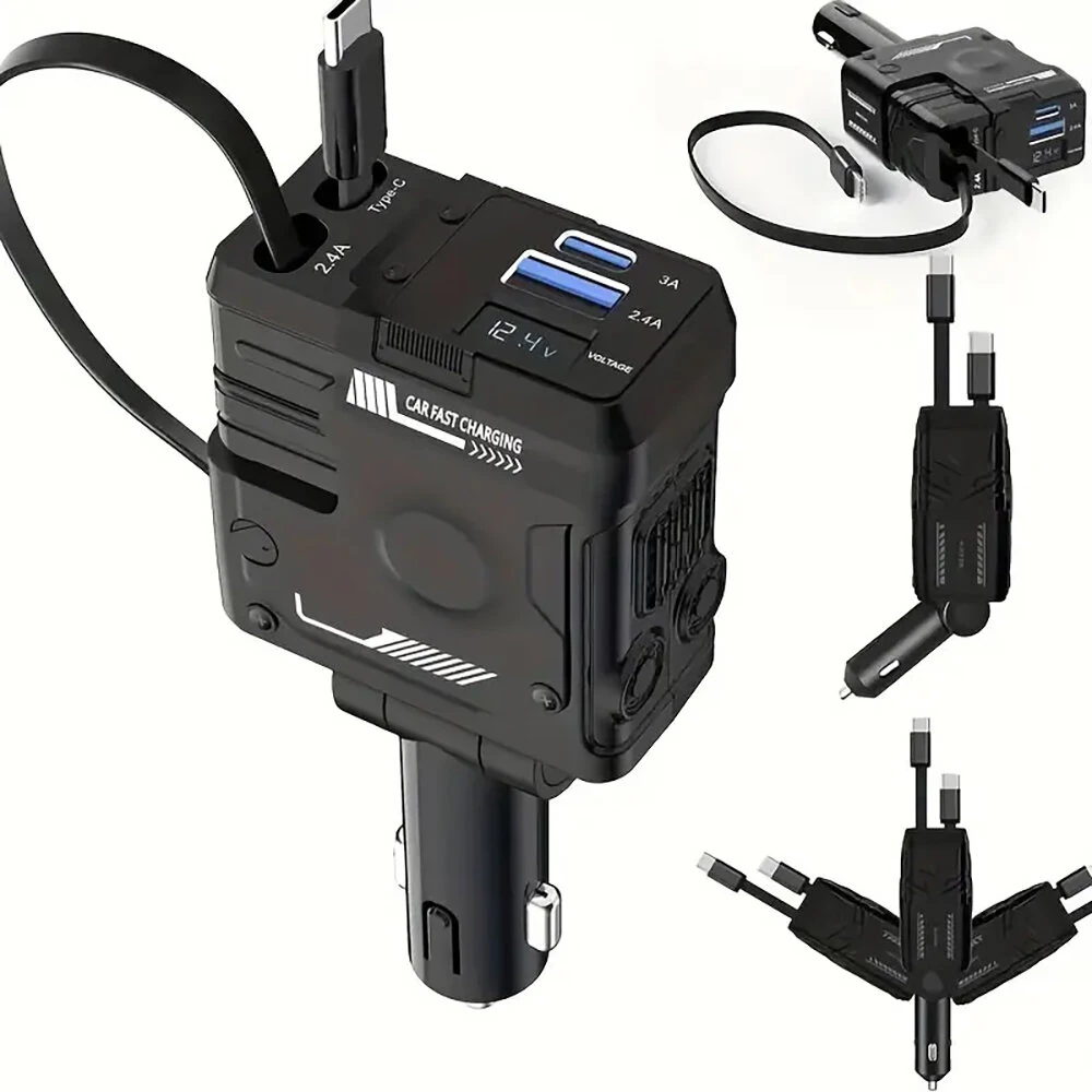 المواصفات:اسم المنتج: شاحن سريع للسيارةالكابلات المدمجة: 2 × كابل Type-C قابل للسحب، يمكن تمديده حتى 80 سم (31.5 بوصة)الحد الأقصى لمعدل الطاقة: 66 واطالمادة: الألومنيوم + ABSالتوافق: المركبات 12V-24Vميزات الأمان: حماية من الشحن الزائد، حماية من الجهد الزائد، التحكم في درجة الحرارة، حماية من الدوائر القصيرةالميزات:- كابلات Type-C مزدوجة قابلة للسحب: يحتوي شاحن السيارة السريع لدينا على كابلي Type-C مدمجين يمكن تمديدهما حتى 80 سم (31.5 بوصة). يسمح هذا التصميم للركاب في المقاعد الخلفية بشحن أجهزتهم بشكل مريح، مما يحافظ على سيارتك خالية من الكابلات المتشابكة ويضمن أن لديك دائمًا كابل شحن في متناول اليد.- شحن فائق السرعة 4 في 1: يدعم الشاحن طاقة قصوى تبلغ 66 واط، مما يوفر سرعات شحن فائقة السرعة أسرع بثلاث مرات من الشواحن التقليدية. يمكنه تشغيل ما يصل إلى أربعة أجهزة في نفس الوقت بأمان، مما يجعله خيارًا فعالًا لرحلات العائلة أو التنقل الجماعي.- مكونات حماية ذكية: مجهز بمكونات عالية الجودة، يضمن الشاحن شحنًا آمنًا من خلال منع الشحن الزائد، والجهد الزائد، ومخاطر درجة الحرارة، والدوائر القصيرة. يضيف هيكل الألومنيوم وABS المتين إلى موثوقية المنتج وطول عمره.- توافق واسع مع المركبات: مصمم ليتناسب مع معظم طرازات المركب