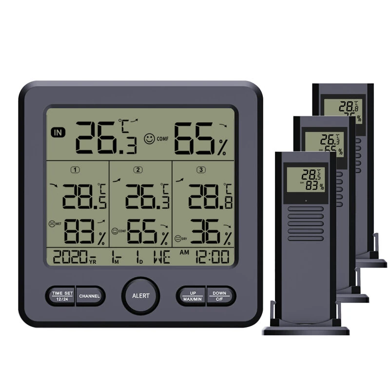 사양:모델: TS-6210제품 색상 : White, Black재료: ABS제품 무게: 267g패키지 무게: 380g제품 크기:주요 단위: 12.5 x 2 x 12.5 cm센서: 5 x 3.7 x 10.5 cm패키지 크기: 18 x 7 x 18 cm전원: AAA 배터리 3개 또는 DC 5V특징:세 개의 실외 채널과 실내 온도/습도를 동시에 표시합니다.2. 3단계 실내 환경 편안함 표시.3. 온도 감지 범위: 실내 (0℃ ~ 50℃), 실외 (-50℃ ~ 70℃).4. 습도 감지 범위: 실내 및 실외(20%~99%).5. 실내 및 실외의 최대 및 최소 온도/습도를 기록합니다.6. 상한/하한 온도 및 습도 한도를 초과하는 경우 알람 기능.7. 향상된 정확성을 위한 온도 및 습도 보정 기능.8. 더 나은 사용성을 위한 백라이트 기능 및 시간/날짜 표시.패키지에 포함된 것:1 x 주요 기상 관측소3 x 무선 송신기1 x 사용자 매뉴얼1 x USB 케이블