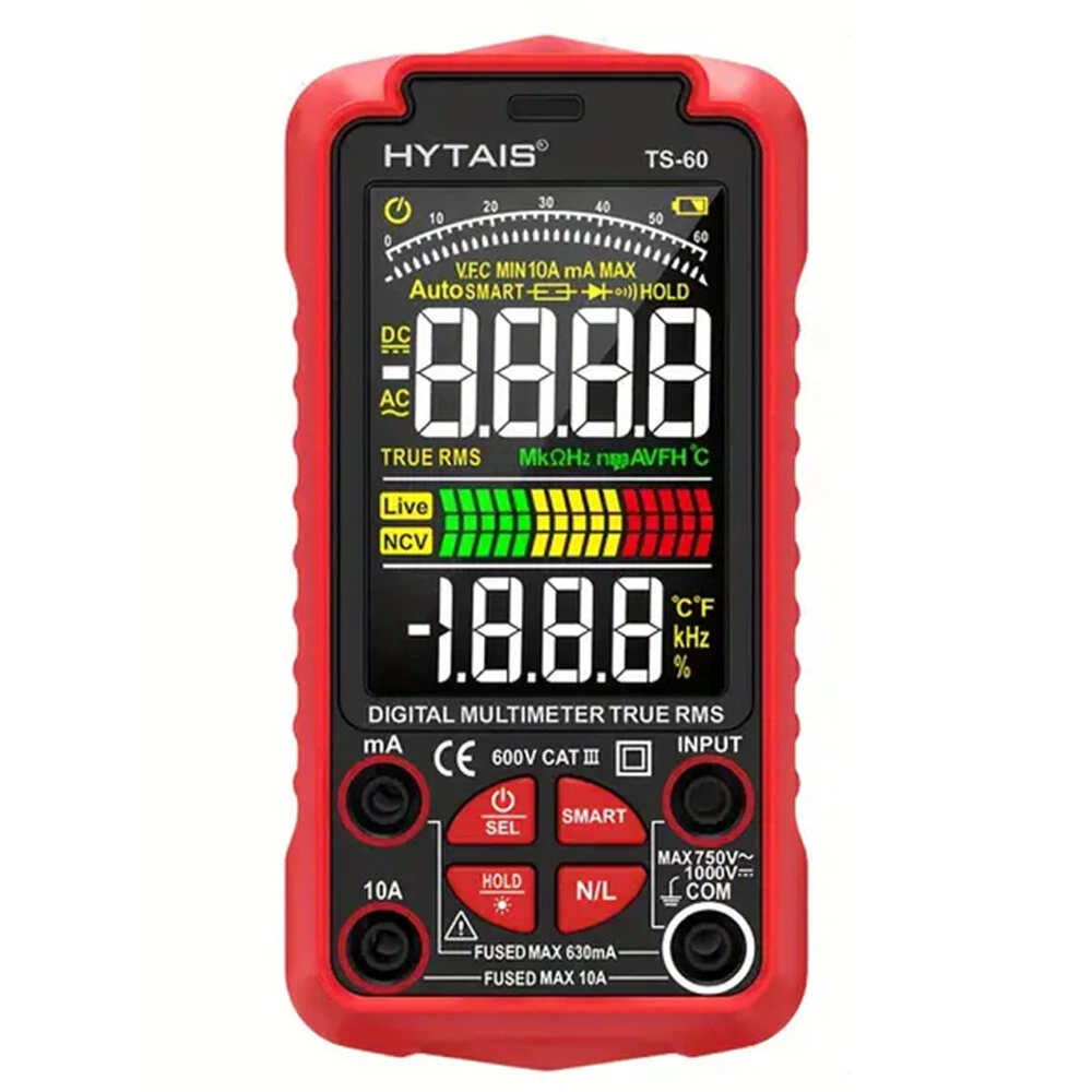 Özellikler:Marka: HYTAIS{"Model": "TS-60"}Ekran: 6000 SayımAC Voltaj Aralığı: 60mV-1000V ±(0,5%+3)DC Voltaj Aralığı: 6V-750V ±(0,8%+5)AC/DC Akım: 60mA-10A ±(1,2%+8)Direnç Aralığı: 600Ω-60MΩ ±(0,8%+3)Kapasite Aralığı: 6nF-60mF ±(4,0%+10)Sıcaklık Aralığı: -40℃~1000℃ / -40℉~1832℉ ±(1.5%+5)Frekans Aralığı: 10Hz~6MHz ±(0.1%+5)Görev Döngüsü: %0.1-%99.9 ±(%0.1+5)Güç Kaynağı: 3.7V lityum pil gücü, şarj edilebilirBoyut: 13.7(U)7(G) 3.2(Y) cm Özellikler:Yüksek Hassasiyet: Hassas ve doğru ölçümler için 6000 sayım.Şarj edilebilir Pil: Uzun süreli kullanım için 1000mAh polimer lityum pili ile çalışmaktadır.Canlı Kablo Tespiti: Ekstra güvenlik için canlı kabloları hızlı bir şekilde tanımlayın.Birden Fazla Ölçüm Fonksiyonu: Voltajı, akımı, direnci, kapasitansı, sıcaklığı ve frekansı ölçer.Kullanıcı Dostu Tasarım: Güvenli tutuş ve kolay kullanım için kaymaz plastik kaplama. Paket içeriği:1 x Dijital Multimetre1 x Test Kablosu Seti1 x Kullanıcı Kılavuzu1 x Pil1 x USB Şarj Cihazımso-bidi-font-family:'Times New Roman';font-size:10.5000pt;mso-font-kerning:1.0000pt;mso-bidi-font-family:'Times New Roman';font-size:10.5000pt;mso-font-kerning:1.0000pt;