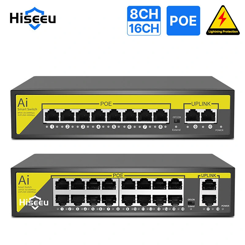 사양:브랜드: Hiseeu모델: 유럽 버전 (하드 드라이브 없음)파워 오버 이더넷 (POE) 스위치채널: 8/16CH이더넷 속도: 10/100Mbps지원: IEEE802.3af/at호환 가능: IP 카메라 / CCTV 보안 카메라 시스템 / 무선 액세스 포인트특징:1. 쉬운 설치: 이 POE 스위치는 추가 전원 콘센트가 필요하지 않으며 IP 카메라나 보안 카메라 시스템에 쉽게 설치하고 연결할 수 있습니다.2. 신뢰할 수 있는 전원 공급: IEEE802.3af/at을 지원하여이 스위치는 연결된 장치에 신뢰할 수있는 전원 공급을 제공하여 중단되지 않는 감시를 보장합니다.3. 빠른 이더넷 속도: 이 스위치는 10/100Mbps의 빠른 이더넷 속도를 지원하여 원활하고 고품질의 비디오 스트리밍이 가능합니다.IP 카메라 및 CCTV 시스템에 적합 : 이 스위치는 IP 카메라 및 CCTV 보안 카메라 시스템과 함께 작동하도록 특별히 설계되어 안전에 대해 민감한 사람들에게 이상적인 선택입니다.5. 다재다능한 사용: IP 카메라 및 CCTV 시스템 외에도이 스위치는 무선 액세스 포인트 (AP)와 함께 사용하여 매끄러운 네트워크 연결을 제공 할 수 있습니다.패키지에 포함되어 있는 것:【8CH】:1x 8CH 스위치1x 전원 어댑터 (EU)8개 나사1x 설명서【16CH】:16개 채널 스위치 1개1x 지지대1x 전원 어댑터 (EU)8개 나사1x 설명서