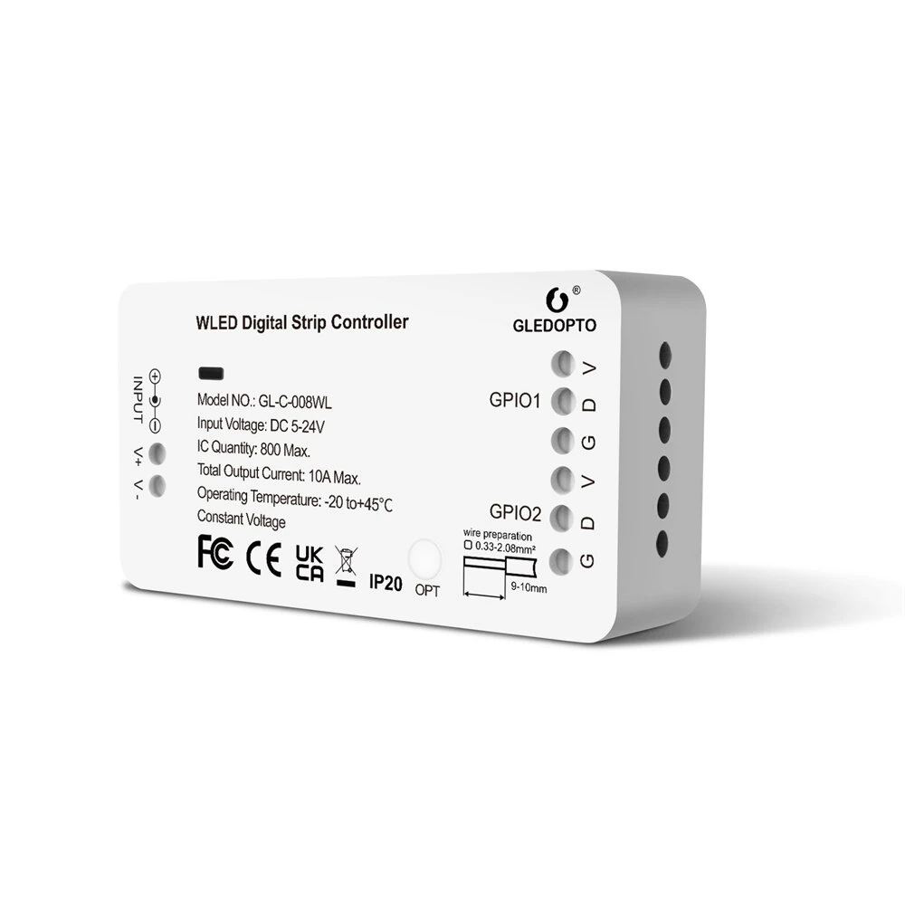 사양:브랜드: GLEDOPTO모델 : GL-C-008WL전압 : DC 5-24VIC 수량: 800 Max현재 총계 : 10A 최대크기 : 89 * 48 * 23.5mm작동 온도: -20-45°C특징:- 제어 방법: Gledopto WLED 라이트 스트립 컨트롤러는 WLED 앱을 사용하여 무선 제어 및 Wi-Fi 인터페이스를 통한 원격 제어를 지원합니다.- 다이나믹 모드: WLED 앱에는 생일 파티, 와인 시음, 저녁 휴식 등 다양한 응용 시나리오에 적합한 100가지 이상의 다이나믹 모드가 있습니다.- DIY 모드: 내장 모드 외에도 Gledopto WLED 라이트 스트립 컨트롤러는 사용자가 선호에 따라 여러 모드를 DIY할 수 있도록 사용자 정의 모드를 지원합니다.- 라이트 스트립 호환성 : Gledopto WLED 라이트 스트립 컨트롤러는 최대 800 개의 라이트 스트립 IC를 지원하며 WS2812B, SM16703P, SK6812, WS2811 등 다양한 라이트 스트립과 호환되어 사용자에게 유연한 선택을 제공합니다.- 응용 시나리오 : Gledopto WLED 라이트 스트립 컨트롤러는 가정, 비즈니스, 엔터테인먼트, 전시 등 다양한 장소에서 널리 사용되어 다양한 분위기 효과를 만들고 색다른 삶을 선사합니다.포함된 패키지:1 x WLED 스트립 컨트롤러1 x 사용자 매뉴얼