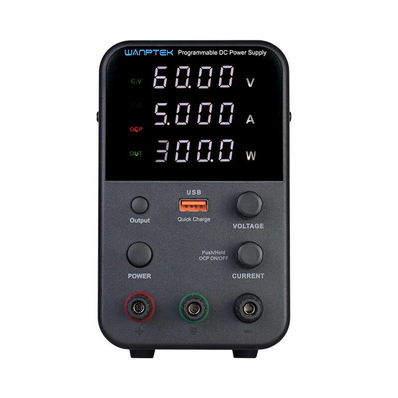 Description: Nouveaux produits de la série de Wanptek. Ce modèle est une alimentation à commutation miniature de courant continu. La tension et le courant de sortie peuvent être contrôlés et ajustés respectivement à l'aide de résistances variables, ce qui offre plus de commodité et de précision dans le réglage de la tension et du courant. Le panneau offre également un affichage numérique à tube à haute précision à deux/trois fenêtres pour la visualisation de la tension, du courant et de la puissance, permettant aux utilisateurs de voir intuitivement l'état d'utilisation actuel et divers paramètres de la machine.L'encodeur contrôlé par programme ajuste la tension et le courant.2. Trois groupes de tubes digitaux à quatre chiffres affichent respectivement la tension, le courant et la puissance.3. Avec le bouton de sortie OUTPUT.4. Avec protection d'alarme de court-circuit OCP.5. Avec une interface de charge rapide USB, il prend en charge plusieurs protocoles de charge rapide.6. L'interface de communication hôte USB de l'ordinateur peut être sélectionnée pour réaliser le contrôle de l'ordinateur et du PLC. SpécificationMarqueWanptekModèleWPS305HWPS605HWPS3010HWPS1203HWPS1602HTension de sortie0~30V0~60V0~30V0~120V0~160VSortie actuelle0~5A0~5A0~10A0~3A0~2APuissance de sortie150W300W300W360W320WWenvironnement de travail ITension d'entrée: AC 230V/115V±10%50Hz/60HzTempérature de travail: 0℃〜40℃;humidité relative:Température de stockage: -10℃〜70℃; humidité relative:Tension constante C