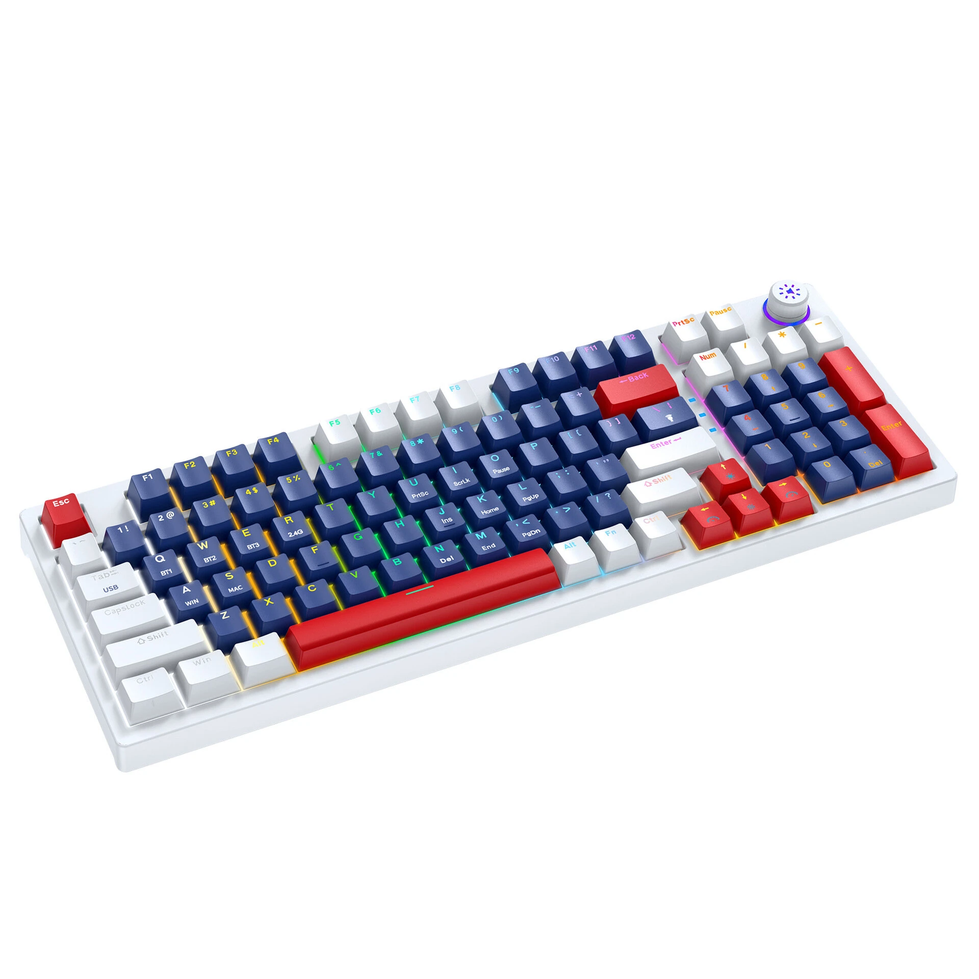 사양:모델H96키캡ABS 이중 색상 주입백라이트RGB레이아웃96 Keys핫 스왑 가능지원인터페이스Type-C 유선연결2.4G/BT5.1/Type-C배터리1800mAh케이블 길이1.5M크기387*138*41mm무게800g스위치빨간색 스위치특징: 1. 삼중 모드 연결: 최고의 유연성을 위해 2.4G 무선,블루투스 5.1 및 유선 연결 간에 쉽게 전환하세요.2. 핫 스왑 디자인: 납땜 없이 스위치를 교체하여 타이핑 경험을 사용자화하세요.3. RGB 백라이트: 사용자 설정에 맞게 조정 가능한 RGB 백라이트로 생생한 조명 효과를 경험하세요.4. 멀티미디어 조정 노브: 전용 멀티미디어 노브를 사용하여 볼륨과 미디어 재생을 편리하게 조정하세요.5. 컴팩트 레이아웃: 96키 레이아웃은 게임 및 생산성을 위한 필수 키를 유지하면서 공간 절약형 디자인을 제공합니다. 패키지에 포함된 것:1x H96 기계식 게이밍 키보드1x 키캡 풀러1x 스위치 풀러