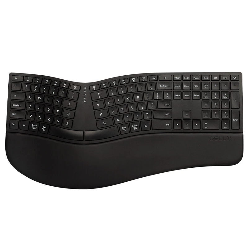 사양: 브랜드: 델룩스모델: GM909치수: 450x235x48mm무게: 933±10g연결: 무선 2.4G/블루투스 5.2배터리 용량: 500mAh키 수: 112개의 키키 수명: 500만 키 입력IC: BK3633레이아웃: QWERTY운영 체제: Win8/Win10/Win11/iOS/Android특징: 1. 얇은 인체공학적 디자인: 자연스러운 아크와 약간의 아치가 타이핑 자세를 개선하고 팔을 책상에 더 가까이 유지하여 스트레스를 줄입니다.2. 전면 분리형 디자인: 손목과 팔뚝의 자연스러운 정렬을 촉진하여 상부 트랩 운동의 근육 활동을 줄입니다.3. 풀사이즈 레이아웃: 추가 기능 키와 단축키로 생산성과 타이핑 정확성을 향상시킵니다.4. 가죽 쿠션 손목 받침대: 부드러운 합成 가죽과 메모리 폼이 손목과 손바닥에 하루 종일 편안함과 지지력을 제공합니다.5. 리튬 이온 배터리: 내장 500mAh 배터리가 긴 작업 시간을 지원합니다. 빠르고 편리한 충전을 위한 Type-C 충전 포트입니다.6. 스위치 키: 조용하고 반응이 빠른 키는 편안하고 정밀한 타이핑 경험을 제공합니다.7. 멀티미디어 기능 버튼: F1-F12 간의 키 기능과 멀티미디어 단축키를 콤보 키로 쉽게 전환할 수 있습니다.패키지에 포함된 것: 1 x DELUX GM909 인체공학적 키보드1 x USB 케이블1 x 사용자 매뉴얼1 x 패키지 상자