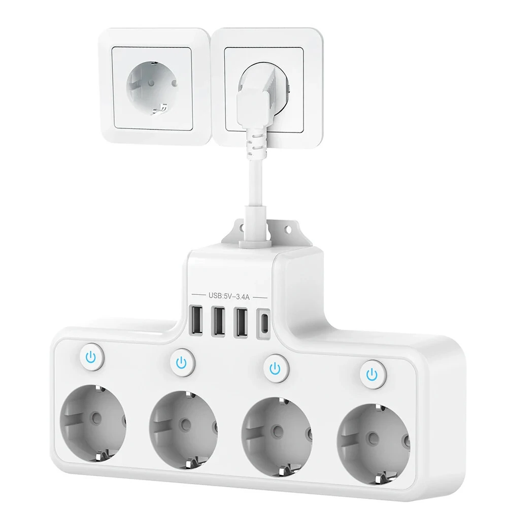 Especificações:Nome do produto: Ficha elétrica de 4 viasSaída AC Máxima: 4000W (250V/16A)Saída USB-C máxima: 17W (5V/3.4A)Saída máxima USB-A: 12W (5V/2.4A)Material: PC+ABS ignífugo classe V0Cor: BrancoRecursos:1. Régua de energia 4 vias: Esta régua de energia possui 4 tomadas EU comutáveis individualmente, proporcionando acesso conveniente a várias fontes de energia.2. Portas USB Múltiplas: Equipado com 3 portas USB-A e 1 porta USB-C, esta régua de energia permite que você carregue vários dispositivos simultaneamente, eliminando a necessidade de adaptadores adicionais.Dupla tomada para montagem em parede: O design duplo da tomada permite fácil montagem na parede, economizando espaço e mantendo seus cabos de alimentação organizados.4. Cabo de 10 cm: Com um comprimento de cabo de 10 cm, esta régua de energia proporciona flexibilidade na colocação, permitindo que você alcance tomadas de energia distantes.Inclui:1x Fita de tomadas