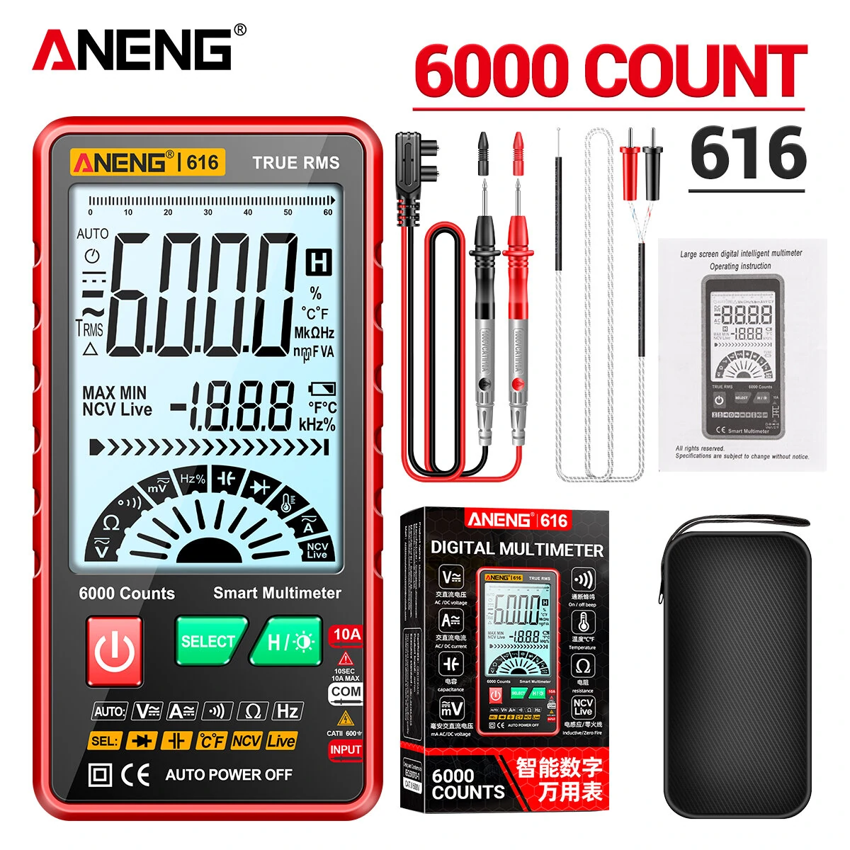 ANENG 616 Büyük Ekran Arkadan Aydınlatmalı Dijital Multimetre 6000 Sayma Ultra İnce Akıllı AC DC Gerilim Akım Multímetro Test AraçlarıAçıklama:Bu ürün, 6000 sayılı LCD ekranlı, pil ile çalışan, otomatik aralıklı, gerçek RMS dijital multimetre.616, 6000 sayım kapasiteli, ceb tipi gerçek etkili değer otomatik taramalı dijital bir metre.616, otomatik olarak farklı giriş voltaj/akım/direnç/vb. sinyallerine göre tanır ve ölçer.616, istikrarlı performans, yüksek hassasiyet ve net okuma özelliklerine sahiptir.616 ayrıca el feneri testi ek fonksiyonlarına sahiptir.616, fabrikalar, öğretim ve elektronik meraklıları için uygun bir araç ve alet olan ideal bir araçtır.Özellikler:FonksiyonAralıkÇözünürlükDoğrulukAC gerilimi0 ~ 600V0,1mV~1V±(1,5%+8d)DC gerilim0 ~ 600V0,1mV~1V±(1.2%+5d)AC akımı0~10A0.1mA~10mA±(2.5%+8d)DC akımı0~10A0.1mA~10mA±(2,2%+8d)Kapasitans6nF~60mF1pF~10μF±(10%+8d)Direniş0~60MΩ0,1Ω~10kΩ±(1.5%+10d)Hz0~10MHz±(4,0%+10d)NCV giriş√Canlı Sıfır Yangın√Diyot/Açık/Kapalı√el feneri√Gerçek zamanlı sıcaklık√veri saklama√pil modeliAAA*2parlak ekran√ürün malzemesiABStel malzemePVC/Brasmax display6000 countstoplam tel uzunluğu100cm/39.37inOtomatik kapanma√Pasiflik durumundan sonra 10 dakika geçtikten sonraNet Ağırlık105g (pil olmadan)Ürün Boyutu137.4*68.4*14.5mm/5.4*2.7*0.57inPaket Listesi:1 * Dijital Multimetre1 * Test Kurşunları1 * İngilizce Kullanıcı Kılavuzu1*Sıcaklık çizgisi1 * Depolama çantası2* İğne Ucu Prob1 * Paketleme kutusu