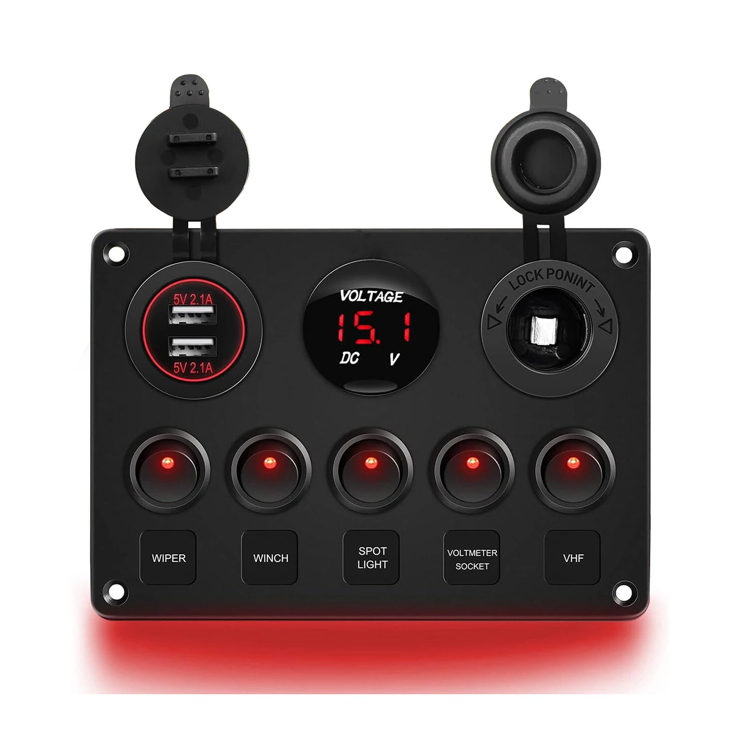 사양:이름: 이중 USB 충전기 전압계백라이트: 빨강 / 파랑 / 초록전압: 12V-24VDCUSB 충전기 출력: DC 5V (2.1A/2.1A) 전원 콘센트: 12VDC 볼트미터 디스플레이 범위: 0-24VDC 과부하 보호: 내장형 15A 인라인 퓨즈 작동 온도: -25도에서 80도까지특징:-- 두 개의 USB 포트로 이 스위치 패널은 편리하게 두 개의 기기를 동시에 충전할 수 있어 시간과 공간을 절약합니다.백라이트 디자인, 백라이트 기능으로 어떠한 어두운 조건에서도 쉽게 조작할 수 있으며 최대한의 편의성과 안전성을 보장합니다.쉽고 편리한 설치 : 스위치 패널은 15A 퓨즈로 사전 배선되어 있으며 조립 스크류가 함께 제공되어 쉽게 설치할 수 있습니다.-- 넓은 호환성 모바일 전화, 태블릿 컴퓨터, 태블릿, GPS 등을 충전하기에 완벽 UTV/ATV, 트럭, 트레일러, RV, 캐러밴, 버스, 해상 보트, 요트 등 대부분의 DC 12V-24VDC 차량에 적합합니다. 포함된 패키지: 1 x 다기능 5개 그룹 스위치 패널 1 x DIY 스티커 4 x 스테인레스 스틸 나사