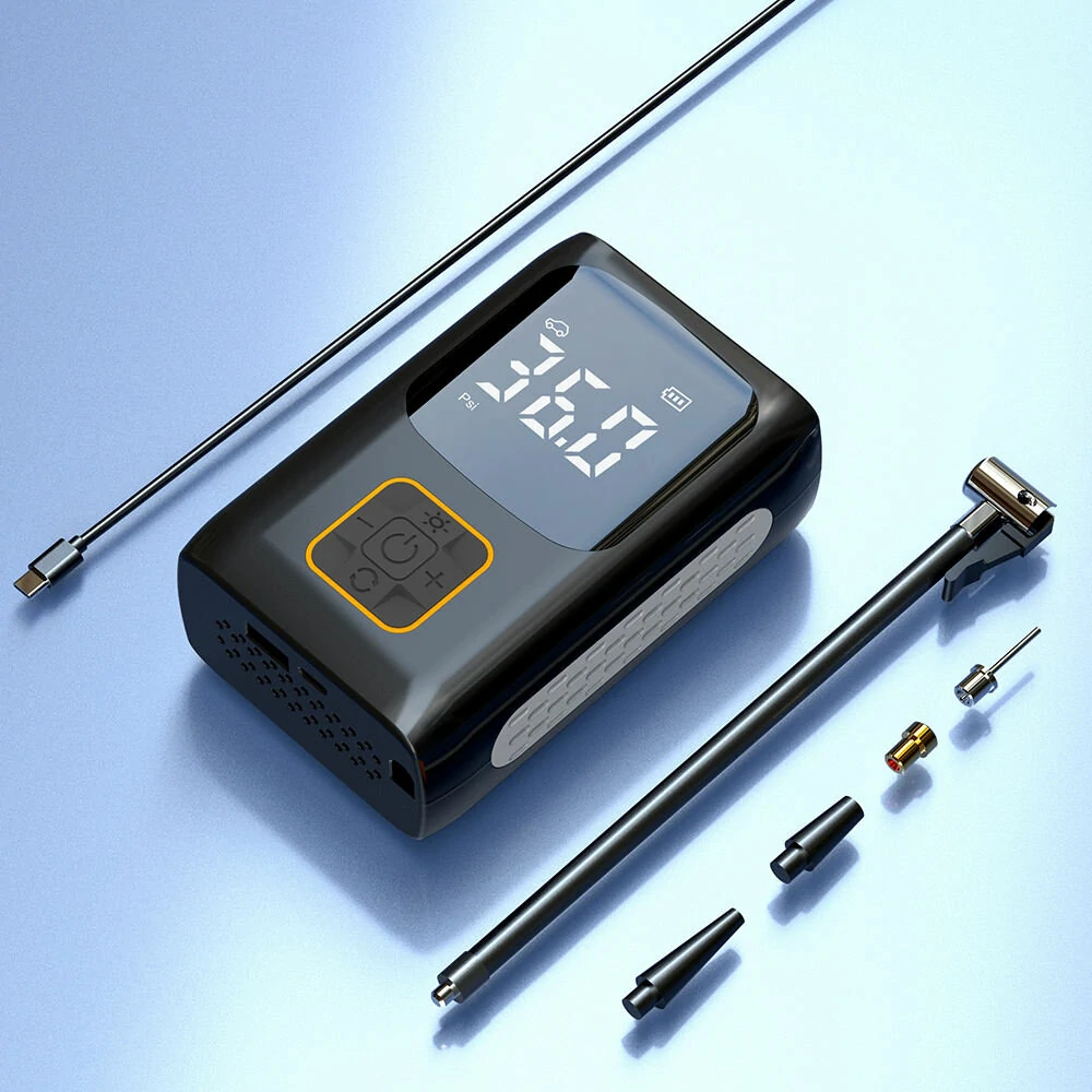 Özellikler:Ad: Araba Hava PompasıMalzeme: ABS plastikGüç: 70WGerilim: 8.4VAna ağ ağırlığı: 420gSilindir iç çapı: 17mmEnflasyon akışı: 15L / DakikaEnflasyon basınç aralığı: 0.3-10.3bar/5-150psiBirim gösterimi: Bar, Psi, Kpa, kg/cm²Güç kaynağı modu: 18650 lityum pil 2*1800mAhŞarj arabirimi: USB Type-CÜrün boyutu: 80*44*125mmRenk kutusu boyutu: 88*76*133mmÖzellikler:Verimli: Sadece birkaç dakikada bir lastik şişirir, zaman ve çaba tasarrufu sağlar.2. Taşınabilir: Kompakt ve hafif tasarım, arabanızda taşımak ve depolamak kolaydır.3. Dijital Ekran: Mevcut basıncı gösterir, kolaylıkla izlemenize ve ayarlamanıza olanak tanır.Çok yönlü: Araba lastikleri, bisiklet lastikleri, spor topları ve diğer şişirilebilir ürünler için uygundur.5. Kablosuz Şarj: Dahili kablosuz şarj pedi, hareket halindeyken telefonunuzu şarj etmek için pratiktir.Paket içeriği:1 x Kablosuz Araba Hava Pompası3 x Nozul Adaptörü1 x Tip C Şarj Kablosu1 x Hava Hortumu2 x Hava Nozulu
