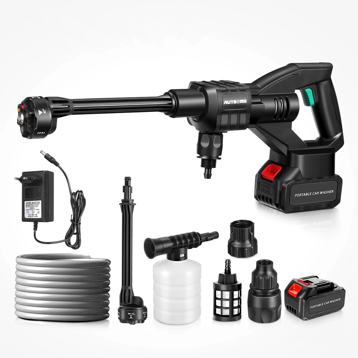 Features:--Powerful brushless motor, long-lasting power, strong energy storage and boosting capacity.--Intelligent lithium battery design, long battery life, single 1500mah battery.--Strong water pressure 6-cylinder supercharged 20D power.--No rope car wash spayer, not limited by the site, easy and quick to operate.--6 in 1 adjustable nozzle, can adjust 6 different shapes of water splash.--Intelligent electronic control, High durability and strong endurance, no need to save electricity to wash the car Large capacity and long endurance, smooth operation without power failure, easy cleaning.--High-strength compression technology range up to 6~8 meters Long Range 6~8m.--Equipped with a foam bottle, it is more convenient to wash the car.--Very suitable for garden watering, agricultural irrigation, car washing, household cleaning, etc.Specification:Brand: AUTSOMEModel: ST-7YS-550Colour: BlackMaterial: Nylon+ABSRated Power: 105WBattery Capacity: 1500mah*10cell=30000mah / 1500mah*5cell=20000mahOperating Voltage: 21VLoad Current: 5ABattery Life Time: 20minMaximum Flow: 2.7/minWater Range: 6-8MPower Cord Length: 70cmInlet Hose Length: 5MMaximum Pressure: 60barMotor cooling mode: automatic coolingCar washing equipment type: Household Car Washing MachineWater source type: Bucket / Bottle / Faucet Self-primingScope of application: Car washing, watering flowers, watering vegetables, spraying, garden cleaning, etc.Plug Type: US Plug / EU PlugBattery Type: 5 cell / 10 cellSafety Warning:1.