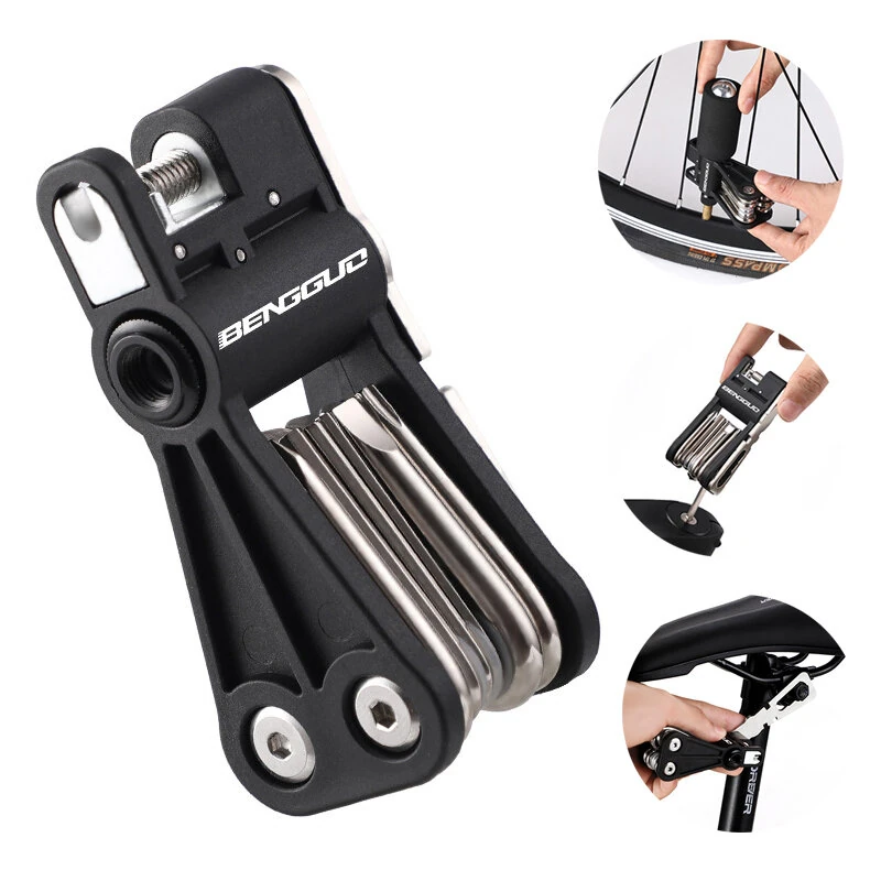 Spécifications:MarqueBENGGUONomOutil combiné portable multifonctionMatérielAlliage d'aluminiumSpécification18 FonctionsPoidsEnviron 221.5 gCouleurNoir Fonctionnalités:Conception pliable et facile à transporter, conception de rangement pliable et pratique pour les déplacements-Tête d'outil en acier plaqué électrolytique / grande résistance à la durabilité-Conception combinée 18 en 1 multifonction et réparation de voiture à faire à une mainListe des paquets:1 x Kit d'outils de réparation de vélo