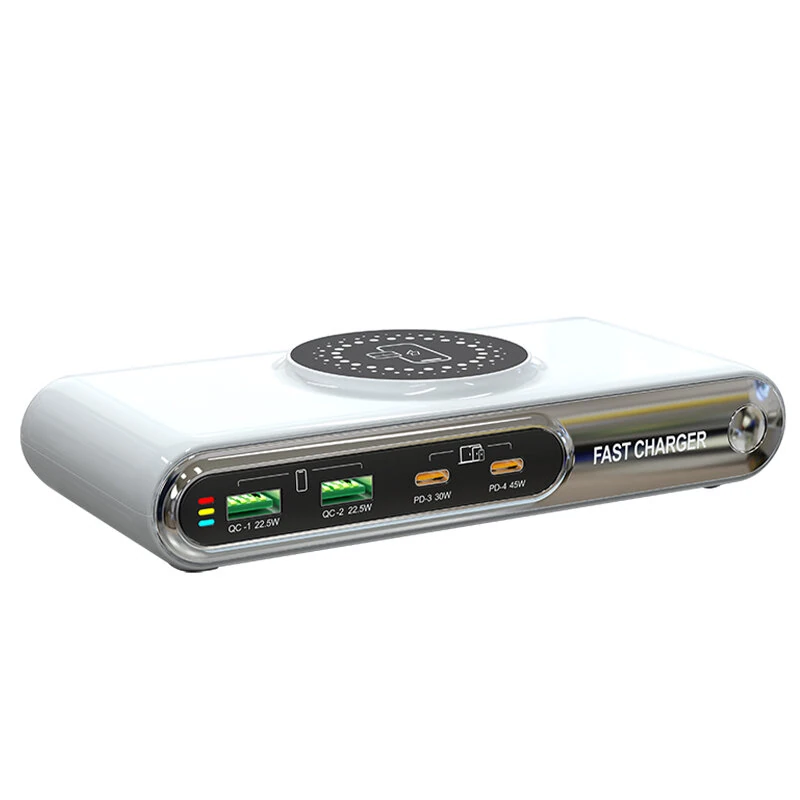 사양:모델WLX-F9A색깔하얀색크기178*80*33mm인터페이스2USB-A+2USB-C입력AC100-240V 50-60Hz출력QC-1:22.5WQC-2:22.5WPD-3:30WPD-4:45W무선 출력: 5-15W프로토콜PD QC3.0유형유럽 플러그/미국 플러그력72W Max특징: 1. 여러 충전 포트: WLX-F9A는 2개의 USB-A 포트와 2개의 USB-C 포트를 갖추고 있어 여러 장치를 동시에 충전할 수 있습니다.2. 빠른 충전: QC-1,QC-2,PD-3,PD-4 출력 옵션을 갖춘 이 충전기는 빠른 충전 기능을 제공하여 장치의 신속한 전원 공급을 가능하게 합니다.3. 무선 충전: 무선 충전 기술을 갖춘 WLX-F9A는 5-15W의 무선 출력을 제공하여 얽힌 케이블의 필요성을 없애줍니다.4. 다재다능한 호환성: PD 및 QC3.0과 같은 프로토콜을 지원하는 이 충전기는 다양한 장치와 호환되며 최적의 충전 성능을 보장합니다.5. 콤팩트하고 여행 친화적: 크기가 178*80*33mm인 이 충전기는 콤팩트하고 휴대가 용이하여 여행이나 일상 사용에 이상적입니다.패키지에 포함된 것:1 x WLX-F9A 데스크탑 충전 스테이션