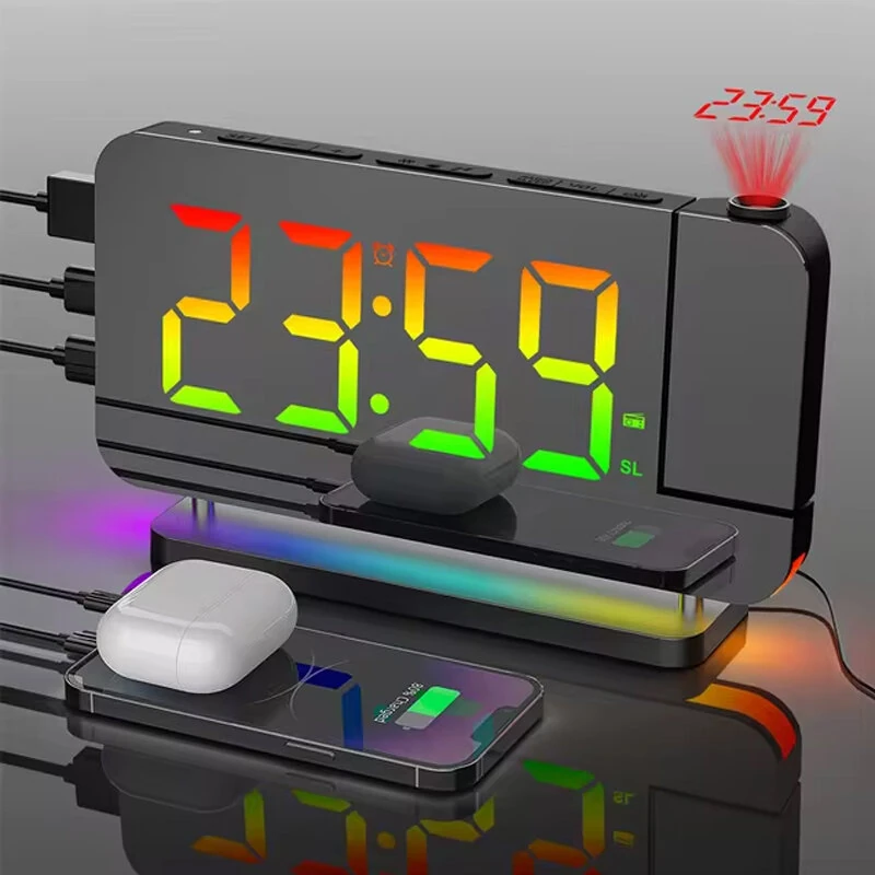 사양:제품 이름: RGB 환경 조명이 있는 프로젝션 알람 시계본체 재질: ABS제품 크기: 16.8 x 9.7 x 4 cm / 6.6 x 3.8 x 1.6 인치전원: DC 5V 외부 전원 공급 장치 (어댑터 없이 일반 배송)내장 배터리 : 2032 버튼 배터리USB 출력 인터페이스: 1 x USB 출력,1 x Type-C 출력프로젝션 디스플레이: 360도 회전 및 조정수동 조정: 밝기,볼륨,알람,스누즈,절전 기능특징:- FM 라디오 기능: 이 프로젝션 알람 시계에는 FM 76에서 FM 108까지의 주파수 범위를 가진 내장 FM 라디오가 있습니다. 자동 방송국 검색 및 저장 기능이 포함되어 있어 수동 조정 없이 좋아하는 라디오 방송을 쉽게 들을 수 있습니다.- 조정 가능한 화면 밝기: 시계는 수동 밝기 조정이 가능한 6단계(100%,80%,60%,40%,20%,꺼짐) 및 주변 빛에 따라 화면 밝기를 조절하는 자동 저전압 기능을 갖추고 있습니다. 이를 통해 화면은 항상 최적의 밝기를 유지합니다. 낮이나 밤이나 관계없이.- 동적 RGB 디스플레이 및 주변 조명: 동적 4 그라데이션 RGB 디스플레이와 7개의 단색 디스플레이로 방의 분위기를 향상시키세요. 네 가지 동적 그라데이션에는 단일 색상,전체 색상,왼쪽에서 오른쪽으로,아래에서 위로의 그라데이션이 포함됩니다. 또한,베이스는 마퀴 조명 색상,전체 색상,호흡하는 그라데이션 효과 및 7개의 단일 색상 설정(따뜻한 흰색,빨간색,노란색,녹색,청록색,파란색,보라색)이 있는 RGB 주변 조명을 가지고 있습니다. 베이스의 주변 조명 밝기는 개인화된 조명 경험을 위해 6단계로 수동 조정할 수 있습니다.- 포괄적인 알람 및 스누즈 기능: 알람 시계 기능에는 여러 알람 설정이 포함되어 있으며,알람이 울릴 때 깜빡이는 빨간 불빛이 추가 기능으로 있습니다. 또한,5분에서 60분 사이의 스누즈 간격을 설정할 수 있는 다용도 스누즈 기능을 제공하며,스누즈 횟수는 무제한이어서 원하는 방식으로 깨울 수 있습니다.- 혁신적인 프로젝션 및 수면 기능: 프로젝션 시계는 360도 회전 및 프로젝션 헤드 조정을 지원하여 방의 어떤 표면에든 시간을 투사할 수 있습니다. 또한 에너지를 절약하기 위한 수면 동면 기능이 포함되어 있습니다. 추가로 시계에는 두 개의 USB 출력 포트(하나 USB 및 하나 Type-C)가 있으며,편리함을 위해 12/24시간 형식 전환을 지원합니다. 고화질 거울 디자인(PC와 하드 거울)은 일반 거울로도 사용 가능하여 기능성과 미학을 접목합니다.포함된 패키지:1 x 프로젝션 알람 시계1 x 버블 가방1 x 영어 매뉴얼1 x 1.5m USB 케이블1 x 2032 버튼 배터리1 x 가죽 상자(참고: 시계를 사용하려면 플러그를 꽂아야 하며,배터리만으로는 작동할 수 없습니다.)