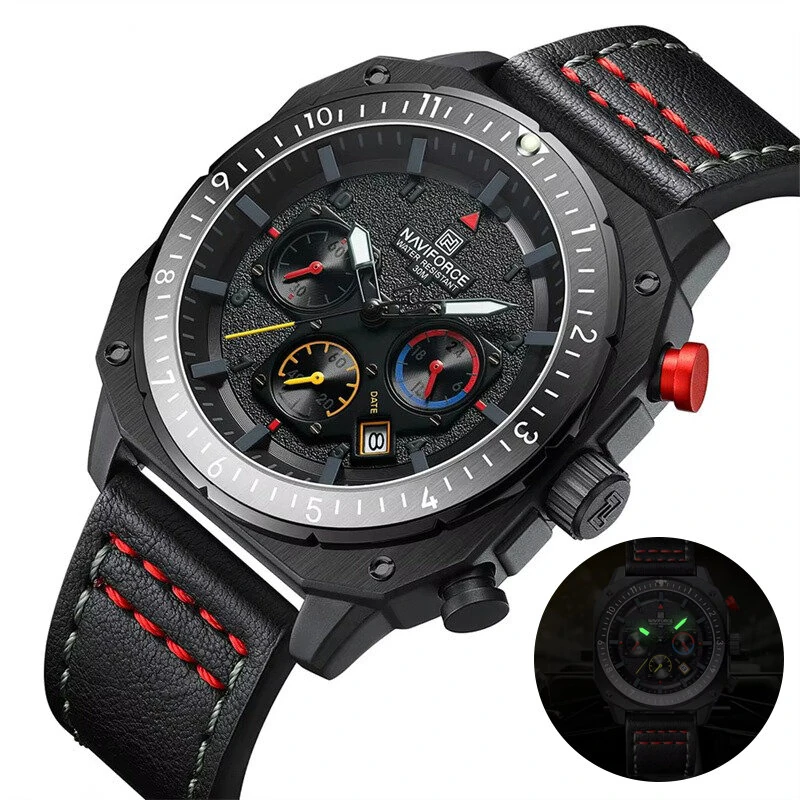 사양:브랜드NAVIFORCE모델8057운동쿼츠 크로노그래프 무브먼트성별남성 & 남자스타일패션,캐주얼,스포츠,비즈니스다이얼 윈도우 재료강화 미네랄 유리밴드 재질진 genuine 가죽 스트랩축구형바클케이스 재질아연 합금케이스 형태둥근버클에서의 스트랩 너비22mm케이스 직경45mm케이스 두께14.5mm전체 길이265mm러그 폭24mm제품 무게98g기능3ATM 방수,24시간 표시,발광 시계 바늘패키지에 포함되어 있는 것:1 x 시청하다1 x 시계 상자노트:빛과 화면 설정 차이로 인해 물건의 색상이 사진과 약간 다를 수 있습니다.다른 수동 측정으로 인해 약간의 치수 차이가 있을 수 있습니다.