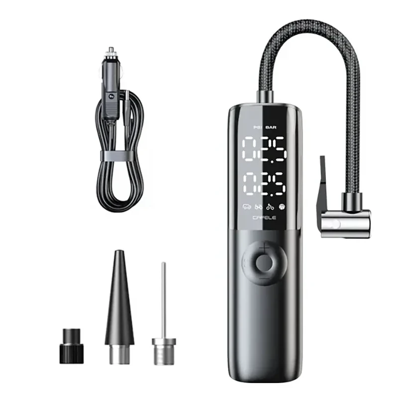 Özellikler:Marka: CAFELEModel: CF-CQ01Ad: Araba Hava PompasıÇalışma Gerilimi: 12 V / 24 VBasınç Aralığı: 2-150 PSI (Maks)Çalışma Sıcaklığı: 0-45°CBoyut: 170 x 45.5 x 46 mmAğırlık: 308 gÖzellikler:- Çok Fonksiyonlu Uygulama:Sedan lastiklerinin, motosiklet lastiklerinin, bisiklet lastiklerinin ve basketbol gibi çeşitli spor ekipmanlarının şişirilmesi için uygundur. Her mod, farklı ihtiyaçlar için optimal şişirme sağlamak üzere önceden ayarlanmış basınç ayarları ile birlikte gelir.- İki Dijital Ekran:Entegre çift dijital ekran, hem ayarlanmış hem de mevcut lastik basıncının hassas bir şekilde izlenmesine olanak tanır. Bu özellik, verimli şişirme sağlar ve istenilen basınca ulaşıldığında otomatik olarak kapatılarak aşırı basıncı önler.- Hızlı Şişirme Teknolojisi:Hızlı şişirme teknolojisi ile donatılmış olan pompa, lastiklerin ve spor ekipmanlarının şişirilmesi için gereken süreyi önemli ölçüde azaltır. Gelişmiş karbon fiber piston ve AI sensör çipi ile güçlendirilmiştir, her seferinde verimli bir performans sunar.- Yerleşik LED Aydınlatma:Gece veya acil durumlarda net görünürlük için yerleşik bir LED el fenerine sahiptir. Bu,düşük ışık koşullarında lastik şişirmeyi kolaylaştırarak kullanıcılara ek bir güvenlik ve rahatlık katıyor.- Taşınabilir ve Kullanıcı Dostu Tasarım:Kolay taşınabilirlik için kompakt ve hafif tasarım. Kolayca gezinebilen kontroller ile basit kullanıcı arayüzü, hem acemiler hem de deneyimli kullanıcılar için sorunsuz bir kullanım sağlar. Uzun 3.5 m kablo, tüm l