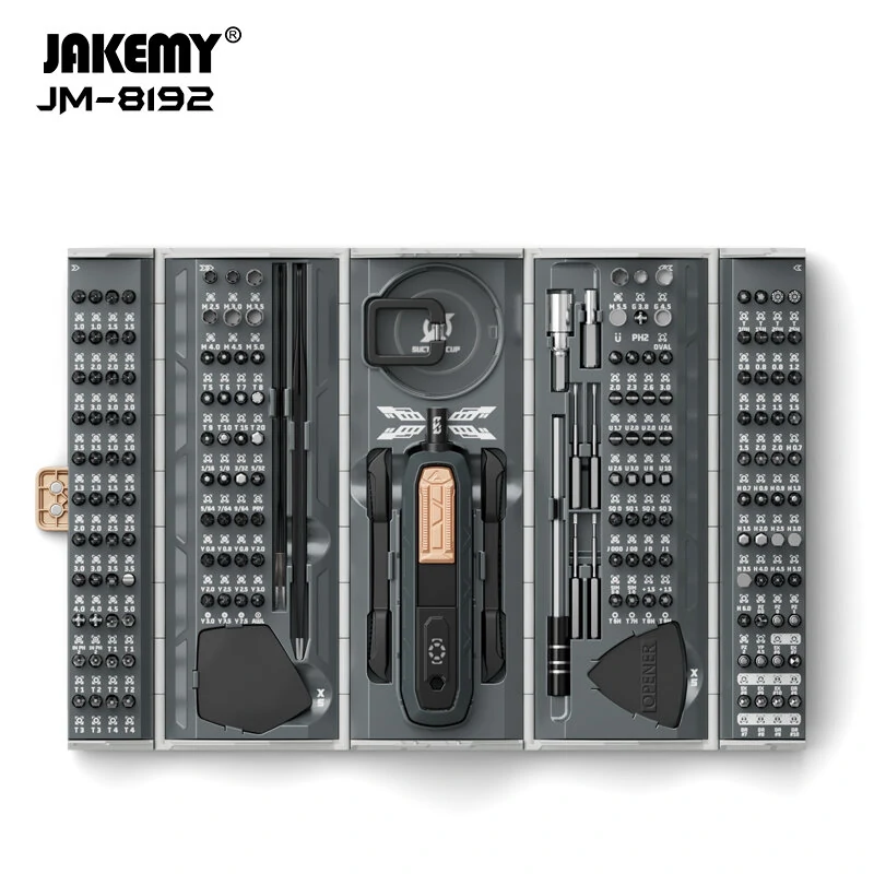 특징:총 180개 세트: 모든 도전에 대해 이 포괄적인 180개의 정밀 스크류 드라이버 세트로 대응할 수 있습니다. 휴대폰 수리, 전자 제품 및 DIY 작업에 이상적입니다. 나사부터 소켓까지, 이 세트에는 필요한 모든 것이 포함되어 있습니다.특수 나사 제거기: 어떤 수리 작업에서도 가장 짜증나는 측면 중 하나는 파손된 나사를 다루는 것입니다. 이 키트에는 어려운 나사를 제거하기가 이전보다 쉬워진 전문 나사 추출기가 소개되었습니다.고품질 CR-V 비트: 고품질 크롬 바나듐 (CR-V) 소재로 제작된 144개 비트로 오랜 신뢰성을 보장합니다. T1에서 T20H,H0.7에서 H6.0 등 다양한 비트 크기로 다양한 수리 요구 사항을 해결할 수 있습니다.혁신적인 핸들과 내장 마그네타이저: 창의적인 핸들 디자인은 편안한 그립과 탁월한 토크를 보장하며, 내장된 마그네타이저는 모든 나사와 비트를 확인할 수 있도록 합니다. 더 이상 작은 부품들을 헤메이지 않아도 됩니다.다기능 액세서리: 스크류 드라이버 비트 외에도 이 세트에는 개폐 도구, 집게, 스퍼지 및 연장 막대 등 다양한 액세서리가 포함되어 있습니다. 이 도구들은 모든 시나리오에 대비할 수 있도록 준비되어 있는지 확인할 수 있게 해줍니다.사양:모델: JM-8192구성품: 180개특징: 나사 추출기비트 재료: 크롬 바나듐 (CR-V)비트 범위: T1에서 T20H까지, H0.7에서 H6.0 및 그 이상액세서리: 오프닝 도구, 집게, 스파지더, 연장 막대크기 및 무게: 1807875mm, 880g내장 자석제작기: 예비트 유형:T1*3/T2*3/T3*2/T4*2/T5/T6/T7/T8/T9/T10/ T15/T20/T6H/T7H/T8H/T9H/T10H/T15H/ T20H/T25H H0.7*2/H0.9*2/H1.3/H1.5/H2.0/H2.5/ H3.0/H3.5/H4.0/H4.5/H5.0/H6.0 + 1.0*2/1.5*3/2.0*2/2.5*2/3.0*3/3.5*2/JIS000/ JIS00/JIS0/JIS1 1.0*2/1.3*2/1.5*2/2.0*2/2.5*2/3.0*2/3.5*2/ 4.0*2/4.5/5.0 1/16 / 1/8 / 3/32 / 5/32 / 5/64/ 7/64/ 9/64 Y0.8*3/Y2.0*2/Y2.5*2/Y3.0*2/Y3.5*2 人 0 U1.7/ U2.0*2/U2.6*2/U3.0/U8.0/U10 0.8*3/1.2*3/1.5*3/2.0*2 大 PZ00/PZ0/PZ1/PZ2 SQ0/SQ1/SQ2/SQ3 2.0/2.3/2.6/3.0 O SIM 0.8/SIM 1.0 0 IN PH2*2 1.5*2 O YP4.5 O AWL e PRY EX#6/EX#7/EX#8/EX#9/EX#10 O DR#6/DR#7/DR#8/DR#9/DR#10 31.5/2.0 1.5/2.0 M2.5/M3.0/M3.5/M4.0/M4.5/M5.0/M5.5/ G3.8/G4.5/ü/PH2/OVAL H4.0mm 에서 H6.3mm 소켓 H6.3mm 에서 H4.0mm 소켓포함된 패키지:1 x 수동 드라이버162 x 스크류 드라이버 비트5 x 개방 도