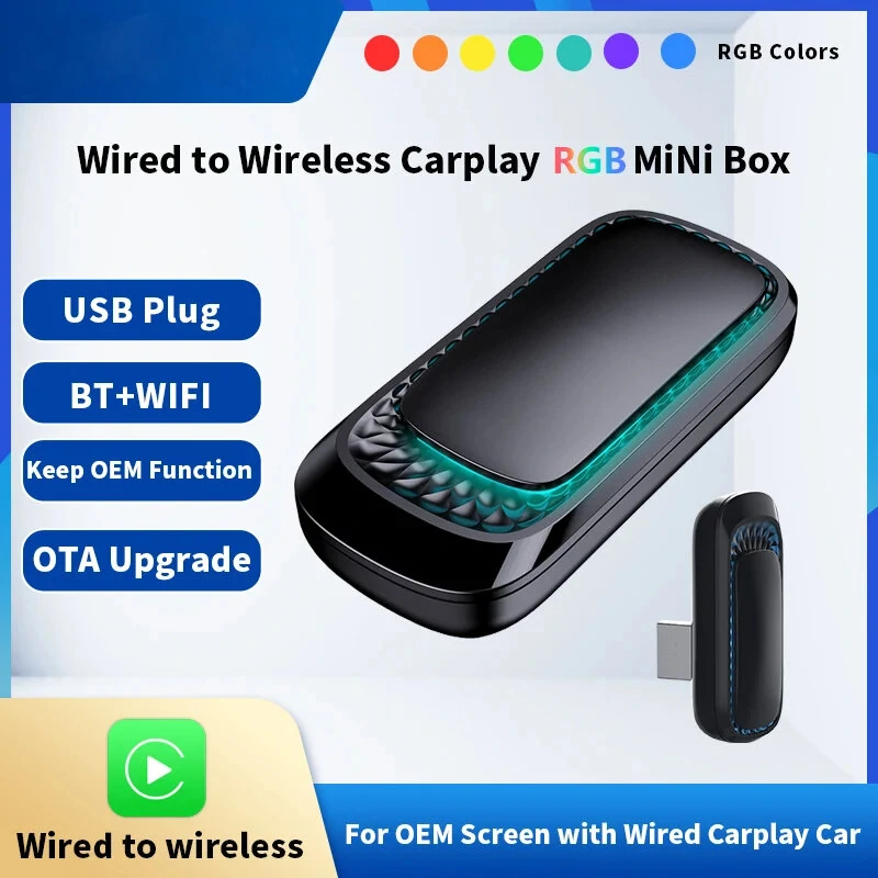 Carplay AI 상자는 원래 OEM 유선 Carplay을 무선 Carplay으로 변환하는 기능을 합니다.사양:이름: 유선에서 무선 CarPlay 박스 어댑터시스템: 리눅스 기능 : 유선 연결된 와이어리스 카플레이 및 7 색상 라이트 연결: BT5.0 / WiFi 2.4G 및 5.8G 포트: USB 실행: -20℃~70℃ 전압: 5V=1A무게: 12g 특징:유선에서 무선 CarPlay 어댑터, 코드와 이별을 고하십시오.① OEM 라디오를 제거하지 않고 USB 플러그 앤 플레이 설치;② 3초 안에 설치, 너무 쉬워요; ③ 600 개 이상의 차종과 호환 가능합니다.더 나은 무선 성능을 위한 5GHz WiFi 모듈입니다.2. 아이폰 설정 시 CarPlay에 자동 연결.원래의 Apple CarPlay와 유사한 제어.4. OTA 온라인 소프트웨어 업데이트.5. 더욱 빠르고 좋은 무선 경험을 위한 공인 5Ghz WiFi 모듈.패키지에 포함되어 있는 것:1 개의 유선에서 무선 CarPlay Box 어댑터참고:iPhone 6 및 이후 모델, 소프트웨어 버전 iOS 10 이상 지원.이 어댑터를 사용하면 OEM 자동차 스테레오에서 무선 CarPlay를 사용할 수 있습니다.가장 중요한 것은 설치가 매우 쉽고, USB 플러그 앤 플레이로 3 초 이내에 완료됩니다.