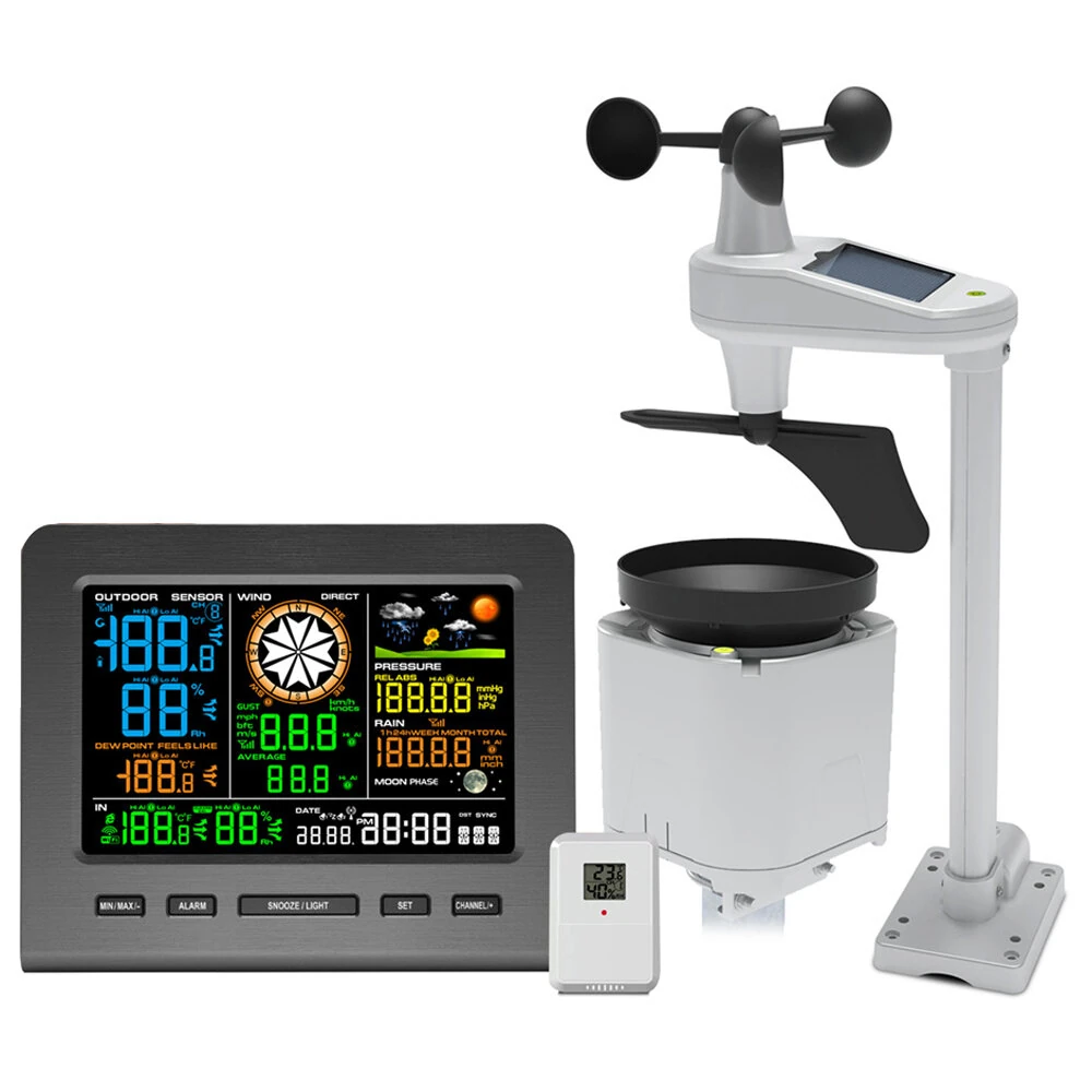 Özellikler:Marka: NicetyMeterDış Sıcaklık Aralığı: -40°C ile +60°Cİç Mekan Sıcaklık Aralığı: 0°C ile +60°CSıcaklık Hassasiyeti: ±1ºCNem Aralığı: %10 ila %99 (Çözünürlük %1)Nem Doğruluğu: ±5%Atmosferik Basınç Aralığı: 300 ila 1100 hPaBasınç Hassasiyeti: ±3 hPaYağış Gösterimi: 0–9999mmÇözünürlük: 0,3mm (1mm (>1000mm)Yağış Doğruluğu: Rüzgar Hızı Hassasiyeti: 2m/sn~10m/sn (+/-3m/sn),10m/sn~56m/sn (+/-10%)Rüzgar Yönü Doğruluğu: 8 puanRüzgar Hızı Aralığı: 0~50m/sVeri İletim Aralığı: 60sİletim Frekansı: 433,92MHzKablosuz İletim Mesafesi: 100 metre (açık alan)WiFi Standardı: 802.11 b/g/nWiFi Frekansı: 2.4 GHzWiFi İletim Mesafesi: 20mGüç gereksinimleriAna Ünite: 2 x AAA pil ve EU/ABD/İNGİLTERE/AU adaptörü (pil dahil değildir, adaptör çıkışı 5.9V~0.5A)Rüzgar Hızı Sensörü: 4 x AAA pil (pil dahil değildir)Yağış Sensörü: 2 x AAA pil (piller dahil değildir)Sıcaklık ve Nem Sensörü: 2 x AAA pil (piller dahil değildir) Özellikler:Kapsamlı Hava Verisi: Rüzgar hızı, rüzgar yönü, yağış miktarı, sıcaklık, nem ve atmosfer basıncını ölçer ve kapsamlı bir hava izleme çözümü sunar.Kablosuz Bağlantı: Verileri 100 metreye kadar kablosuz olarak aktarır, Wunderground veya Weathercloud'a hava durumu verilerini yüklemek için WiFi yeteneğine sahiptir ve gerçek zamanlı izleme sağlar.Yüksek Hassasiyet: ±1ºC sıcaklık hassasiyeti ve ±5% nem hassasiyeti ile hassas ölçümler sunarak, tüm hava koşulları için güvenilir veriler sağlar.Sık Güncellemeler: 60 saniyelik veri iletim aralığı, zamanında güncellemeler sağlar