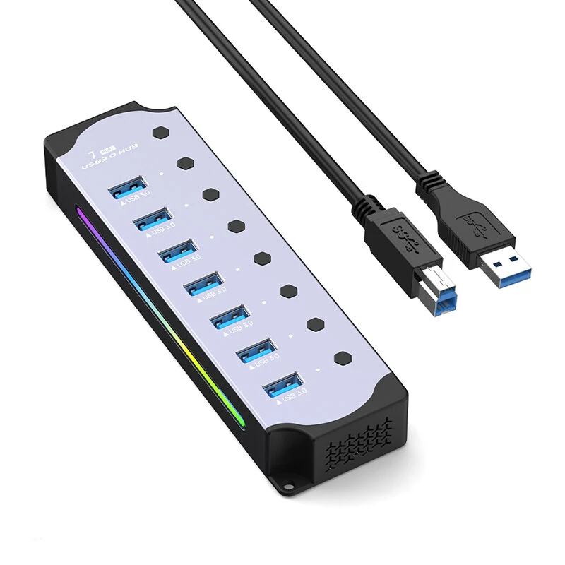 المواصفات:النموذجYX-U3H701لونرماديمادةسبيكة الألمنيومواجهة الإخراجUSB3.0*7معدل الإرسال5Gbpsطول الكابل1Mالحجم (الطول × العرض × الارتفاع)172.3*50*25.3mmالوزن240gالميزات: 1. منافذ USB 3.0 عالية السرعة: يتميز YX-U3H701 بسبع منافذ USB 3.0، مما يوفر معدلات نقل بيانات تصل إلى 5Gbps، مما يسمح لك بتوصيل عدة أجهزة في وقت واحد.2. شريط الضوء RGB: ألوان RGB متعددة رائعة مع ثلاثة أوضاع للضوء (تنفس، وبث، وضوء جري) لإضافة جاذبية جمالية لمساحة عملك.3. مفاتيح تشغيل/إيقاف مستقلة: يحتوي كل منفذ على مفتاح تشغيل/إيقاف فردي ومؤشر LED للتحكم بسهولة في الطاقة للأجهزة المتصلة.4. هيكل من سبائك الألمنيوم المتينة: مصنوعة من مادة سبائك الألمنيوم طويلة الأمد، يوفر هذا المحور USB متانة محسّنة وتبديدًا للحرارة، مما يضمن أداءً موثوقًا.5. سهل التوصيل والتشغيل: لا حاجة للتثبيت أو البرامج. فقط قم بتوصيل محور USB بجهاز الكمبيوتر أو الكمبيوتر المحمول الخاص بك، وهو جاهز للاستخدام، مما يجعله مثالياً للاستخدام في المنزل والمكتب.6. توافق متعدد الاستخدامات: هذه المحور USB متوافقة مع مجموعة متنوعة من الأجهزة USB، بما في ذلك لوحات المفاتيح، والماوس، والأقراص الصلبة الخارجية، والطابعات، وأكثر من ذلك، مما يجعلها حلاً متعدد الاستخدامات لاحتياجات الاتصال الخاصة بك.يشمل الحزمة:1x YX-U3H701 USB 3.0 هاب1x كابل بيانات1x كابل الطاقة1x دليل