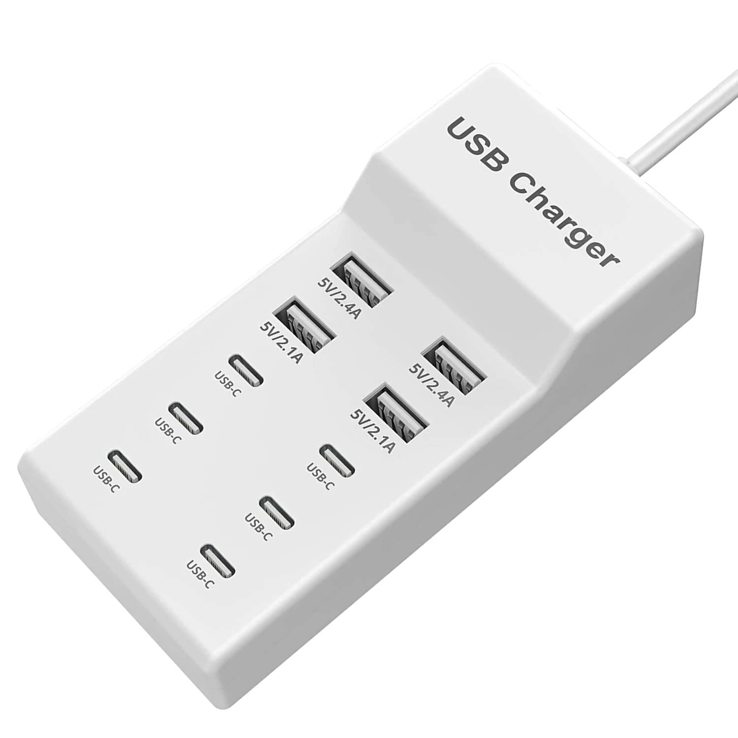 Specification Input 100 240V 50 60HzTotal Power 5V 50W 10A maximum Weight 240 grams 10 5 ouncesProduct Size 16CM 7CM 3CMPower Cord Length 150CMPlug Options EU Plug US PlugFeatures 1 Wide Compatibility Compatible with a diverse range of smartphones tablets watches headphones cameras e readers USB fans power banks bluetooth headsets MP3 MP4 players drones and more 2 10 Port Advantage Equipped with 6 USB C ports and 4 USB A ports allowing simultaneous charging for up to ten devices The charger automatically detects all connected devices and adjusts the output accordingly to ensure consistent voltage minimizing charging time 3 Enhanced Security Protection Latest upgraded version with an integrated security chip and independent current output for each USB port ensuring improved charging safety Features a flame retardant PC shell with overheat overcharge overcurrent overload and short circuit protection to protect devices and extend their battery life 4 CompactLightweight Design With a sleek and compact design this USB hub charger is perfect for desktop applications at home school office and parties It is lightweight and easy to carry making it a convenient charging solution 5 Efficient Output Management The upgraded chip ensures that each port operates independently providing a steady and optimal charging performance without interference between ports Package Include 1 x 50W 10 Port Desktop Charging Station1 x Power Cord 150CM 1 x