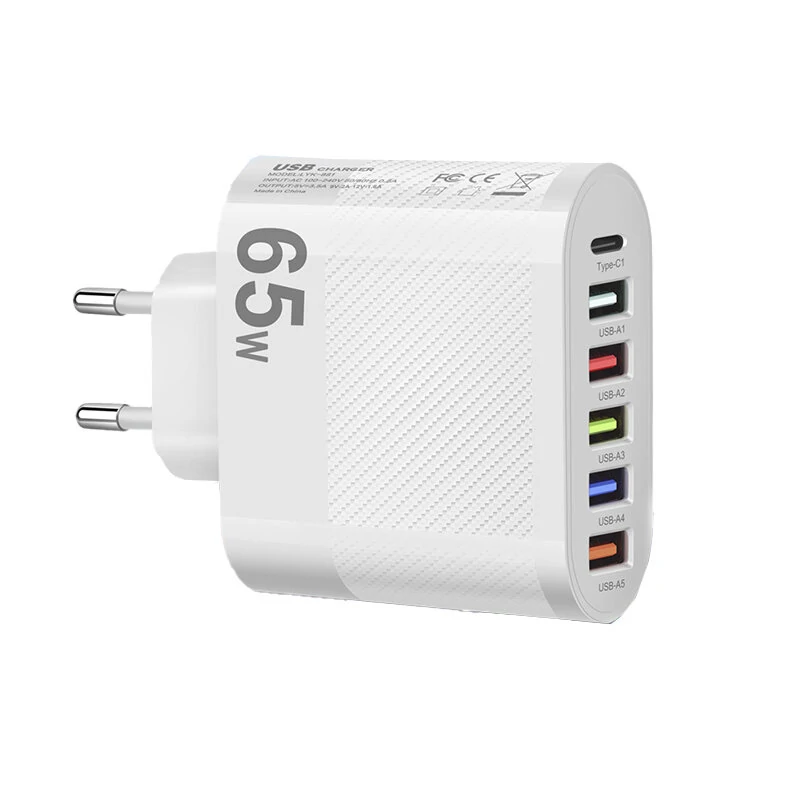 Specifiche:Nome del prodottoCaricatore USB a 6 porte da 65WModelloLYK-881ColoreNero/BiancoMaterialePCDimensioneUE: 28*68*96mm / USA: 28*68*78mmInterfaccia5USB-A + Tipo-COra pronto a tradurre il testo inglese nel seguente modo: """IngressoAC100-240V 50/60Hz 0.5ARisultato5V/3.5ATipoEU Plug/US PlugPotere65WCaratteristiche: Porte di ricarica multiple: dotato di 5 porte USB-A e una porta Tipo-C, facilitando la ricarica di più dispositivi contemporaneamente.2. Alta efficienza energetica: Con 65W di potenza, il caricatore garantisce una ricarica rapida ed efficiente.3. Ampia compatibilità: l'ingresso CA di 100-240V lo rende compatibile per l'uso internazionale.4. Dimensioni compatte: Le sue piccole dimensioni, 28*68*96mm per spine dell'UE e 28*68*78mm per spine degli Stati Uniti, lo rendono estremamente portatile e adatto ai viaggi.5. Materialee di sicurezza: Realizzato in materiale PC, il caricatore mantiene un design robusto e affidabile.La confezione include:1 x Caricabatterie USB a 6 porte LYK-881 65W