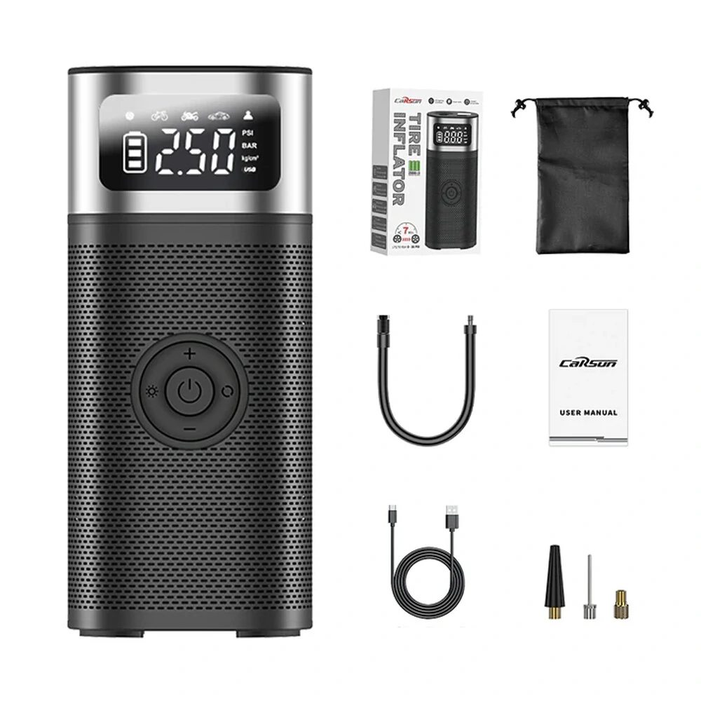 Özellikler:Marka: CarsunÜrün Modeli: T2190Ad: Taşınabilir Araba Hava Pompası Batarya Kapasitesi: 2000mah*3 Silindir Özellikleri: 19 Silindir İş Gürültüsü: 85DBNominal Gerilim: 11.1VÇıkış Hava Basıncı: 150PSINominel Güç: 70W Şarj Süresi: 2-4 saatMevcut Derecelendirme: ≤7Aİç Kutu Boyutu: 23*19*18.5cm Tam Pil Ömrü: 20 dakika Dış Kutu Boyutu: 40*24.5*39cm Ürün Ambalaj Ölçüsü: 11*6*17.5cm Tek Ürün Net Ağırlık: 572g Özellikler:1. Taşınabilir ve Kullanışlı: Bu yenilenmiş versiyon Carsun Araba Hava Pompası kompakt ve hafif olmasıyla, arabanızın bagajında taşımak ve saklamak kolaydır.2. Kablosuz ve Akıllı: Kabul edilemez kablo kargaşalarına ve sınırlı menzile elveda deyin. Kablosuz tasarımı sayesinde, bu akıllı araba hava pompası akıllı telefonunuzla kolaylıkla kontrol edilebilir.3. Hızlı ve Verimli İnflasyon: Yüksek performanslı bir pompa ile donatılmış olup, araba lastikleriniz, spor toplarınız ve diğer şişirilebilir ürünleriniz için hızlı ve verimli bir şekilde şişirme sağlar.LCD Ekran: Dahili LCD ekranı, mevcut lastik basıncını kolayca izlemenize ve istenen basınç seviyesini ayarlamanıza olanak tanır.5. Otomatik Kapanma: Bu akıllı araç hava pompası, istenen basınca ulaşıldığında otomatik olarak şişirmeyi durduran otomatik kapanma özelliği ile aşırı şişmeyi önler.Paket içeriği:1 X Araba Hava Pompası1 X USB Şarj Kablosu1 X Paket Kutusu 1 X Saklama Çantası 1 X Hava Hortumu 3 X Hava nozzlei1 X Kullanıcı Kılavuzu