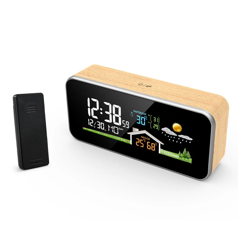 Spécification:Matériau : 100 % bois de hêtreDimensions:Unité principale : 164 x 75 x 41 mmCapteur: 92 x 40 x 23 mmAffichage : Écran LCD VAFormats de temps : 12 heures/24 heuresFonctions d'alarme et de répétitionUnité de température intérieure : °C/°FNiveaux de rétroéclairage : quatre réglages - Élevé,Moyen,Bas,OffPrévision météorologique : prédit des conditions ensoleillées,partiellement nuageuses,nuageuses et pluvieuses dans les 6 à 12 heures.Plage sans fil : portée du capteur RF jusqu'à 200 pieds (60 mètres en espace ouvert)Fonctionnalités:1. Construction en hêtre premium : Fabriqué en 100 % hêtre,garantissant un look élégant et naturel qui s'intègre parfaitement dans la décoration intérieure.2. Prévision Météorologique Complète: Fournit des prévisions météorologiques précises pour les prochaines 6-12 heures,vous aidant à planifier votre journée de manière efficace.3. Options de timing polyvalentes : propose des formats horaires de 12 heures et 24 heures adaptés aux utilisateurs du monde entier, combinés à une fonction d'alarme et de répétition.4. Flexibilité de la température : Affiche la température intérieure à la fois en Celsius et en Fahrenheit,répondant à différentes préférences régionales.5. Rétroéclairage réglable : quatre réglages de rétroéclairage (Élevé,Moyen,Bas,Éteint) pour répondre à votre besoin de visibilité et de confort,en particulier dans des environnements peu éclairés.6. Portée sans fil améliorée : un capteur RF qui fonctionne jusqu'à 200 pieds (60 mètr