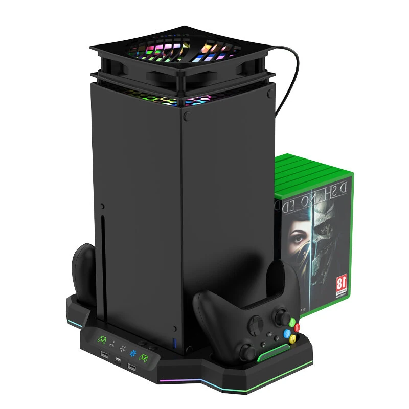 Özellikler:Model: HBX-6085V/2000mA5V/2000mANet Ağırlık: 640gBrüt Ağırlık: 763gÖzellikler:1. Üst Montajlı Soğutma Fanı: Entegre aydınlatma efektleri ile ısı dağıtımını artıran,ayarlanabilir 3 hız ayarına sahip güçlü bir üst montajlı fan ile donatılmıştır.2. Disk Depolama Rafı: 7 oyun diskine kadar tutabilen kullanışlı bir raf içerir.3. RGB Aydınlatma Efektleri: Oyun kurulumunuzun estetiğini artırmak için canlı RGB aydınlatma efektlerine sahiptir.4. Çift Kontrol Cihazı Şarjı: İki Xbox kontrol cihazını aynı anda şarj etmeyi destekler,kırmızı şarjda ve tamamen şarj olduğunda yeşil gösteren bir LED gösterge ile.5. Çok Fonksiyonlu Tasarım: Xbox Series X için bir kompakt standda soğutma,şarj etme ve depolama çözümünü birleştirir.Paket içeriği:1 x Üst montajlı soğutma fanı1 x Şarj İstasyonu Tabanı1 x Disk Depolama Rafı2 x Kontrolör Pil Paketleri