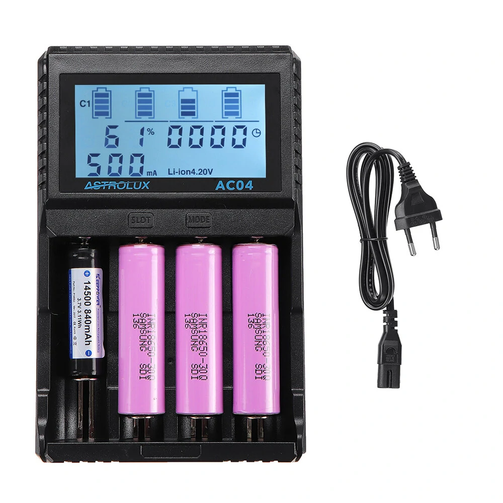 사양:브랜드Astrolux®모델AC04충전 인터페이스내장된 전원 AC 전원 케이블 : 110-240V 50/60Hz 0.4A (Maz)외부 전원 공급: DC12V 2A호환 가능한 배터리 유형1.2V NiMH/NiCd: AA / AAA / AAAA / C / SC3.6V/3.7V/3.85V 리튬 이온/IMR/INR/ICR 3.2V LiFePO4 (최대 길이 75cm) : 10440/14500/14650/RCR16340/16650/17500/17650/17670/18350/18490/18500/18650,20700,21700,22700,26650,26700……충전 종료 전압4.20±0.05V/4.35±0.05V/3.65V±0.05V/1.48V±0.05VR충전 전류500mA×4;800mA×4;1500mA×2 (1 채널 및 4 채널 리이온)충전 차단 전류작동 온도0-65℃충전기 크기165x 105x 38mm / 64.96x 41.34x 14.96inch(길이 x 폭 x 두께)무게350g기능 키 사용하는 방법:4개의 슬롯의 충전 상태를 보려면 'SLOT'을(를) 누르세요.500mA 또는 800mA로 전환하려면 'MODE'를 짧게 누르세요. 2개의 채널이나 3개의 채널에 배터리가 없을 때, 1개 채널 또는 4개 채널은 최대 1500mA까지 가능합니다 (리튬 배터리).배터리 충전 시 배터리 유형을 선택하려면 "MODE"를 길게 누르십시오: Li-ion4.20V; LiFePO4; Li-ion4.35VLCD 화면 표시 기능 :1. 해당 채널 데이터를 나타내는 번호입니다.2. 작동 후 30초 후에 빛이 꺼집니다.3. 어떤 버튼이든 빛을 깨울 수 있습니다.4. 전원이 가득 찬 채널 라이트가 켜집니다.포함된 패키지:1 x ASTROLUX AC04 배터리 충전기(배터리 미포함)1 x AC 전원 케이블 (EU 플러그/미국 플러그)당신의 나라 콘센트에 따른 플러그 어댑터 1 x1 x 사용자 매뉴얼1 x Box