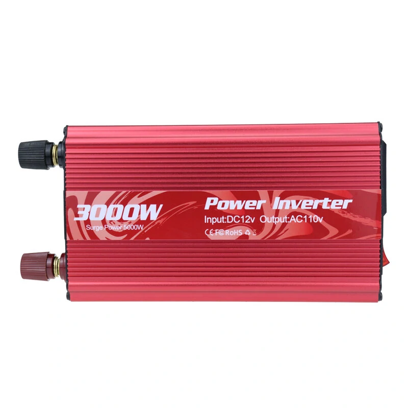 Description Features Sufficient Power With 1 AC Outlets and 1 USB Ports Ideal for Powering iPods Cell Phones Laptops Speakers Cameras Neon Lights Game Consoles Cell Phones iPads and Others Easy to carry Can be used for power needs during vacations road trips camping etc Comes with a universal lighter plug with a long cable that can be plugged into almost any vehicle Multiple Protections Built in fuse to protect your device Safe charging design prevents overheating undervoltage and overvoltage charging short circuits High Quality Inverter Thickened alloy shell to prevent the inverter from falling and impacting LCD screen easy to check the voltage Universal socket USB interface strong adaptability and stable load High Safety Built in cooling fan for extended use time and safety Efficiency up to 90 Higher surge capability to initiate high loads Specifications Power 3000WColor RedNo load current consumption 0 3AInput DC voltage range DC12v DC24vOutput voltage range AC 110 220±5 Output frequency range 50 60 3HzUSB output DC 5V 2 1A Output waveform Modified sine waveMaximum external temperature 75°CMaximum power efficiency 86 High voltage cut off level 16 8 0 5vLow voltage alarm level 10 5 0 5vLow voltage cut off level 9 6 0 5vOverload and short circuit protection YesBuilt in cooling fan YesInput voltage DC 12v DC24vTotal Harmonic Distortion 5 Is there a display screen NoPackage Included 1 x Power Inverter2 x Battery Cli