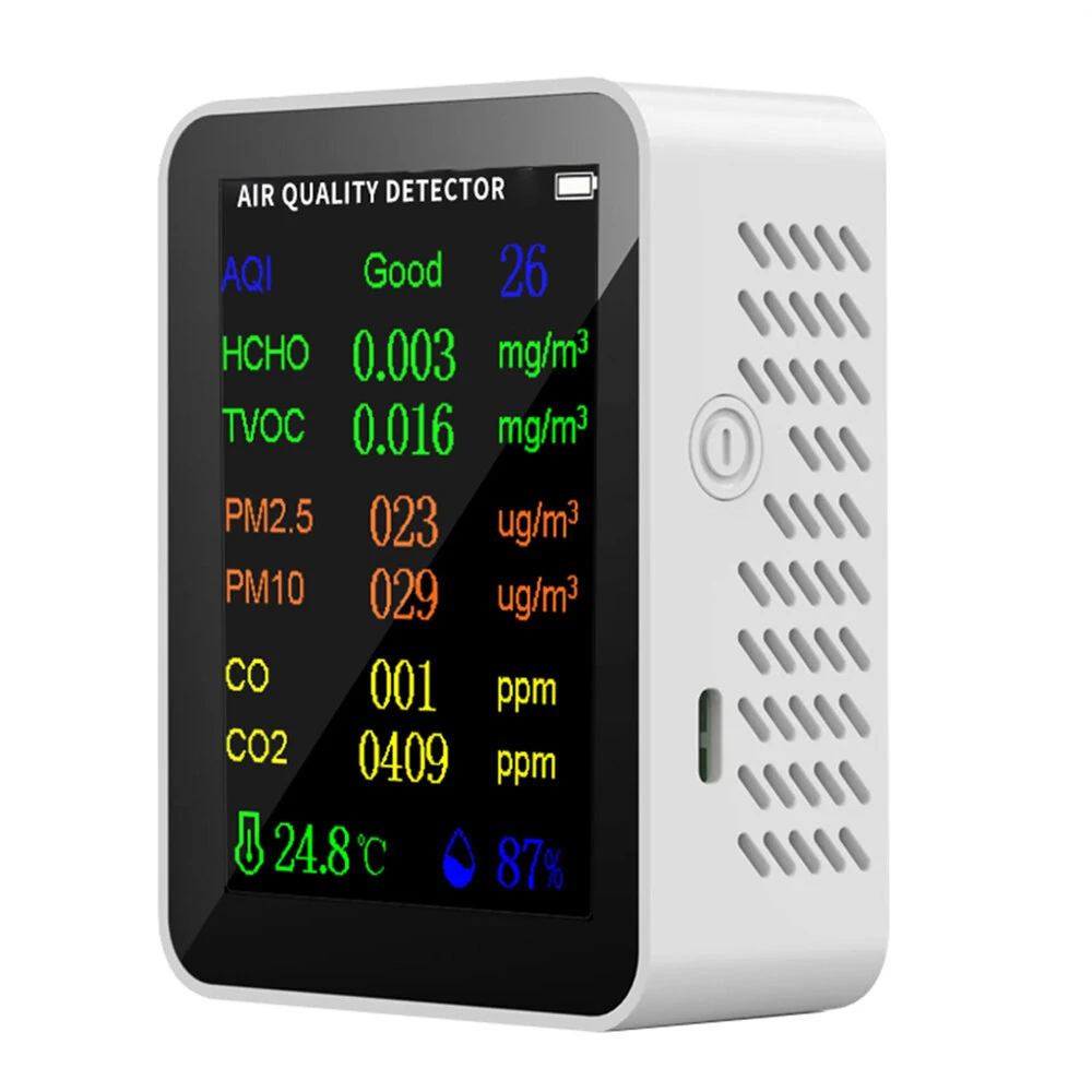انقر هنا لتحميل دليل المنتجmso-bidi-font-family:'Times New Roman';font-size:10.5000pt;mso-font-kerning:1.0000pt;mso-bidi-font-family:'Times New Roman';font-size:10.5000pt;mso-font-kerning:1.0000pt;mso-bidi-font-family:'Times New Roman';font-size:10.5000pt;mso-font-kerning:1.0000pt;الميزات:mso-bidi-font-family:'Times New Roman';font-size:10.5000pt;mso-font-kerning:1.0000pt;شاملة: تم تصميم مراقب جودة الهواء 9 في 1 للكشف بدقة عن PM2.5 و PM10 و HCHO و TVOC و CO و CO2 ، بالإضافة إلى درجة الحرارة والرطوبة ، مما يوفر معلومات مفصلة عن جودة البيئة الخاصة بك.mso-bidi-font-family:'Times New Roman';font-size:10.5000pt;mso-font-kerning:1.0000pt;mso-bidi-font-family:'Times New Roman';font-size:10.5000pt;mso-font-kerning:1.0000pt; عرض سهل القراءة: تتميز الشاشة بشاشة LCD لعرض جميع القياسات والبيانات البيئية بلمحة واحدة.mso-bidi-font-family:'Times New Roman';font-size:10.5000pt;mso-font-kerning:1.0000pt;mso-bidi-font-family:'Times New Roman';font-size:10.5000pt;mso-font-kerning:1.0000pt; محمول وسهل الاستخدام: يمكن استخدام هذا الجهاز بشكل مريح في العديد من المواقع مثل المنازل والمكاتب والسيارات أو أي بيئات أخرى تتطلب تقييم جودة الهواء.mso-bidi-font-family:'Times New Roman';font-size:10.5000pt;mso-font-kerning:1.0000pt;mso-bidi-font-family:'Times New Roman';font-size:10.5000pt;mso-font-kerning:1.0000pt; بطارية ذات عمر طويل: يسمح ببطارية الليثيوم بسعة 1200 مللي أمبير المدمجة بالاستخدام الممتد حتى 360 دقيقة من التشغيل المستمر والموثوق.mso-bidi-font-family:'Times New Roman';font-size:10.5000pt;mso