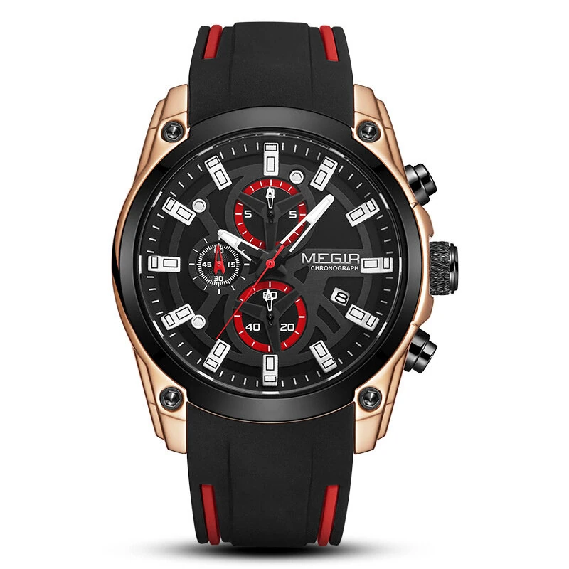 Spécifications:Marque : MEGIRGenre: HommesÉpaisseur du boîtier : 13.5 mmDiamètre du boîtier : 53 mmLongueur du bracelet : 225 mmLargeur du bracelet : 24 mmPoids de la montre : 110 gMatériau du boîtier : alliageMatériau en verre : miroir minéral résistant à l'usureMatériau du bracelet: siliconeFonctions : Heures/Minutes/Secondes/Minuteur/LumineuxFonctionnalités:- Résistant à l'eau 3ATM (Vous pouvez l'utiliser sous la pluie et en vous lavant les mains, NE supporte pas l'eau chaude et la natation);- Avec chronographe (chronomètre) et fonction lumineuse, avec affichage de la date;- Design créatif MEGIR et matériaux de haute qualité.Le package comprend: 1 x Montre à quartzPrécautions pour l'utilisation de la montre:1. Ne rapprochez pas la montre d'objets magnétiques tels que des radios et des téléviseurs pour éviter d'affecter la précision. 2. Ne rapprochez pas la montre de solvants,de sprays cosmétiques,de détergents,de colles ou de peintures,de camphre,sinon le boîtier et le bracelet se décoloreront,se détérioreront ou seront endommagés. Pour éviter que le boîtier et le bracelet ne rouillent ou ne se décolorent,il est recommandé de les laver et de les sécher à l'eau chaque jour (référant aux montres avec la marque d'étanchéité « WATER » au dos du boîtier). Lorsque la montre mécanique n'est pas utilisée,il est préférable de la remonter une fois par mois pour éviter que l'huile à l'intérieur de la montre ne se solidifie. 5. Les montres étanches,antimagnétiques et antichocs ne peuv