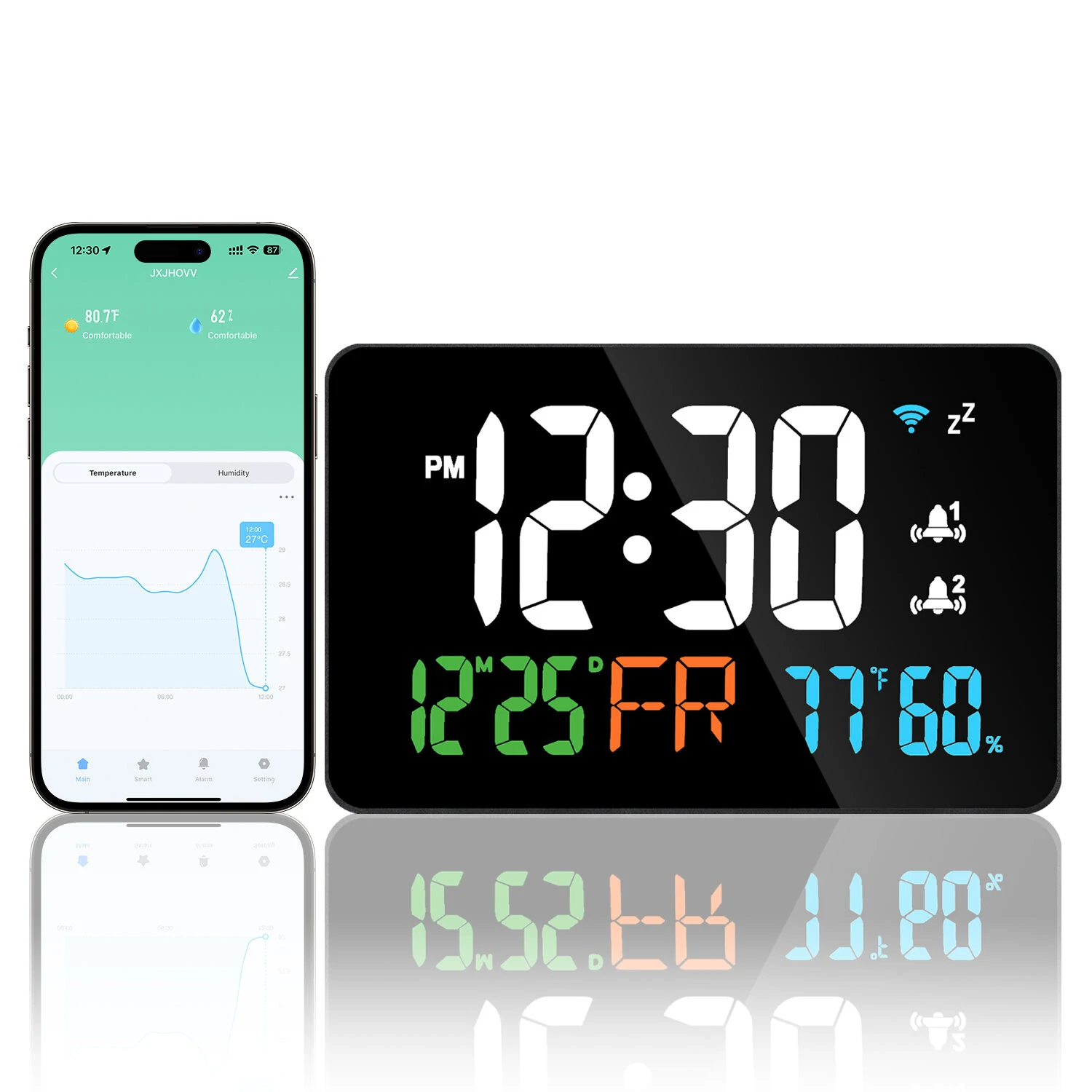 Fonctionnalités:1. 【Connexion Wifi et Mise à Jour Automatique】Réglage automatique de l'heure sans avoir besoin de configuration manuelle. 2. 【Alerte de l'application】Rappel intelligent et détection de la température et de l'humidité qui vous aide à protéger votre maison. L'horloge fonctionne avec l'application Smart Life qui vous permet de visualiser les données historiques. 3. 【4 Niveaux de Luminosité Automatique Réglables】Avec la luminosité réglable sur 4 niveaux, vous pouvez facilement ajuster la luminosité manuellement à l'aide de la télécommande pour obtenir la luminosité souhaitée. L'horloge LED possède un capteur de gradation automatique intégré, qui peut également ajuster automatiquement la luminosité en fonction de la lumière environnante, pour répondre à vos besoins. 4. 【Fonction de Mémoire】Il y a une fonction de mémoire intégrée : même si l'alimentation est coupée, les données d'heure ne seront pas perdues, vous n'aurez donc pas besoin de les réinitialiser. 5. 【Beau et Fonctionnel】Cette horloge murale convient pour le salon, la cuisine, le garage, la ferme, le bureau, la classe, la salle de gym, le magasin, la garderie. Et c'est le meilleur cadeau pour les amis, les partenaires et les personnes âgées.Forfait inclus:1 * Réveil numérique Wifi1 * Câble de chargement1 * Manuel de l'utilisateur