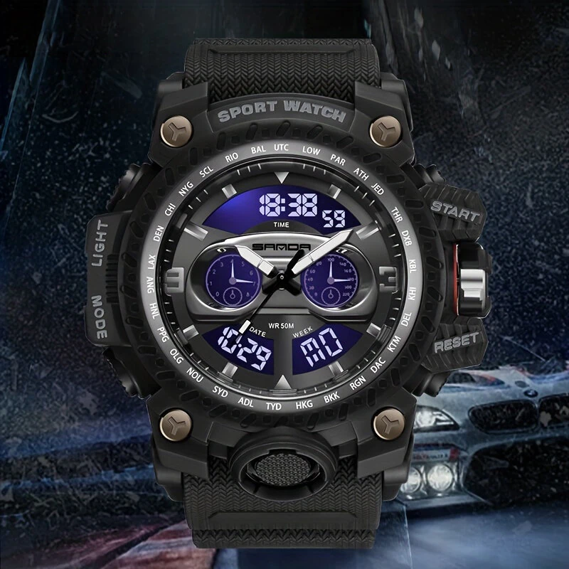 사양:브랜드SANDA이름스포츠 쿼츠 시계운동전자 + 쿼츠거울아크릴 거울시계 스트랩TPU 재료시계 버클스테인리스 스틸 핀 버클시계 케이스ABS방수50m다이얼 너비57mm다이얼 두께17mm대역폭27mm총 시청 시간260mm착용 범위(Max) 230mm / (Min) 160mm체중을 확인하다78g특징:1. 다기능: 스톱워치, 알람, 날짜 표시 등과 같은 기능이 장착되어 있습니다.2. 패셔너블한 디자인: 세련되고 트렌디하며,야외 스포츠 애호가에게 적합합니다.3. 뛰어난 내구성: 오랜 사용을 보장하는 고품질 재료로 제작되었습니다.4. 방수: 수영이나 수상 활동 중에 착용할 수 있으며 손상에 대해 걱정할 필요가 없습니다.5. 사용하기 편리: 시간을 조정하고 설정하기 쉬우며, 일상적인 사용에 적합합니다.패키지에 포함되어 있는 것:1 x 시계1 x 시계 상자참고사항:1. 다양한 모니터와 조명 효과로 인해 항목의 실제 색상이 사진에 표시된 색상과 약간 다를 수 있습니다.2. 수동 측정으로 인한 약간의 측정 편차를 용서해 주십시오.