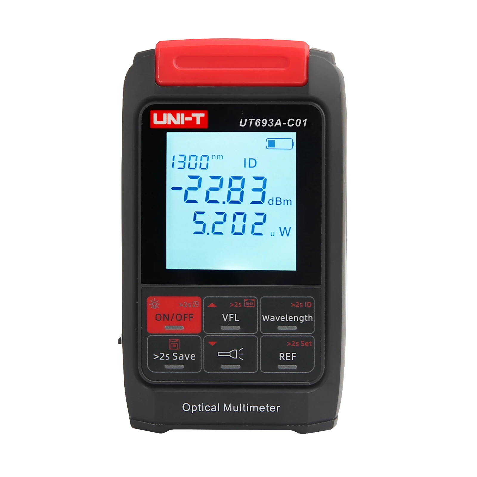 المواصفات:أنواع الطراز: UT693A-C01، UT693A-C30، UT693A-T01، UT693A-T30 (بصري )نطاق قياس الطاقة:UT693A-C01, C30: (-50~+30dBm)UT693A-T01, T30: (-70~+10dBm)دقة:سلسلة UT693A-C: ±0.4dB (1310nm/1490nm/1550nm/1625nm)؛ ±1dB (850nm/980nm/1300nm/1270nm/1577nm/1650nm)سلسلة UT693A-T: ±0.2dB (1550nm); ±0.3dB (1310nm/1490nm/1625nm); ±1dB (850nm/1300nm/980nm/1270nm/1577nm/1650nm)أطوال الموجة المعايرة: 850nm/980nm/1270nm/1300nm/1310nm/1490nm/1550nm/1577nm/1625nm/1650nmنوع الموصل: واجهة عالمية 2.5 ممنوع الكاشف: InGaAsالقرار: 0.01dBmتعرف على الترددات الضوئية: 270Hz/330Hz/1KHz/2KHzالبطارية: بطارية ليثيوم 3.7 فولت 450 مللي أمبيرسعة تخزين البيانات: 500 سجلمنفذ الشحن: Type-Cالأبعاد: 100mm x 59mm x 28mmالوزن: حوالي 95 جرامشروط التشغيل:درجة الحرارة: من -10°C إلى 50°Cالرطوبة: ظروف التخزين:درجة الحرارة: -20 درجة مئوية إلى 45 درجة مئويةالرطوبة: 65 ± 20% رطوبة نسبيةالميزات:نطاق قياس الطاقة الواسع: يدعم كل من نماذج (-50~+30dBm) و (-70~+10dBm) لتلبية سيناريوهات التطبيقات المتنوعة، مما يجعله مناسبًا لمجموعة واسعة من احتياجات قياس الألياف البصرية.معايرة متعددة الأطوال الموجية: متوافقة مع عشرة أطوال موجية للمعايرة (850 نانومتر إلى 1650 نانومتر)، مما يضمن قراءات دقيقة عبر الأطوال الموجية الضوئية الأكثر شيوعًا في شبكات الألياف الضوئية.تصميم مدمج وخفيف الوزن: مع شكل محمول بمقاس 100 مم × 59 مم × 28 مم ووزن 95 جرام فقط، فهو مثالي للمهندسين في الموقع والتركيبات الميدانية.تحسين الاتصال: يتميز بشحن USB Type-C بالإضافة إلى اختبار كابل الشبكة RJ45، مما يوفر مرونة لتثبيت الألياف البصرية الحديثة وشبكات البيانات.إدارة بي
