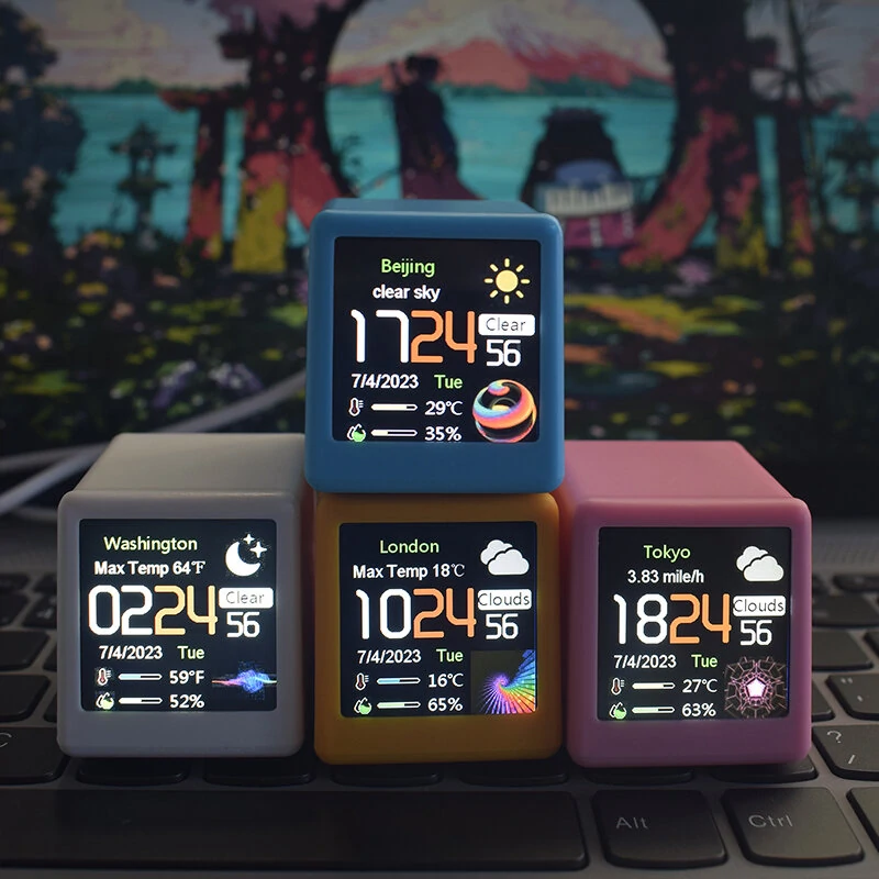 사양:디스플레이 : 컬러 OLED색상: 핑크, 블루, 화이트, 옐로우 (디스플레이의 색상 차이에 대해 감안해주시기 바랍니다.)시계 크기: 35mm x 45mm x 40mm박스 크기: 100mm x 65mm x 45mm무게: 75g특징:멀티 기능 디스플레이 : 이 시계는 전 세계의 시간, 날씨, 날짜, 온도, 습도 등 다양한 정보를 표시할 수 있습니다.2. 다채로운 OLED 디자인: 생동감 있는 OLED 디스플레이는 시각적인 경험을 향상시켜 정보와 애니메이션을 표시하는 다채로운 인터페이스를 제공합니다.3. 실시간 동기화 : 클록은 네트워크 시간을 자동으로 읽어 전 세계 시간과 100% 정확한 시간 동기화를 보장합니다.4. 손쉬운 설정 및 수정 : 시계를 Wi-Fi 네트워크에 연결하고 LAN 주소를 통해 설정에 액세스하여 다양한 옵션을 편리하게 변경할 수 있습니다.5. 우측 하단 애니메이션: 다양한 우측 하단 애니메이션 중 선택하여 데스크톱에 창의성과 재미를 더하세요.포함된 패키지:1x 데스크톱 시계1x USB 케이블1x 설명서