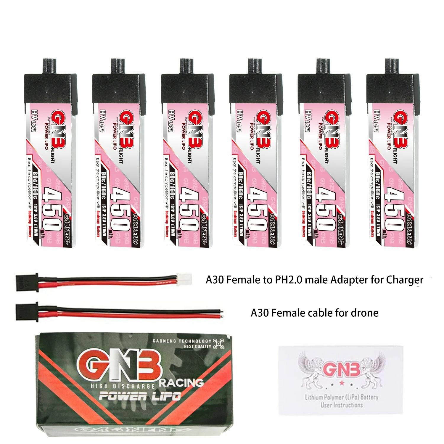 Emax Tinyhawk S BetaFPV Beta75X용 어댑터 케이블이 있는 6개 Gaoneng 3.8V 450mAh 80C 1S LiHV 배터리 A30 플러그적합한 응용 프로그램:이는 75mm FPV 드론, Emax Tinyhawk S, NanoHawk, EZ Pilot Pro, BetaFPV Beta75X, Happymodel Mobula6 Mobula7 Snapper, GEPRC Cinewhoop, Yinywhoop Tiny7, NewBeeDrone Cockroach, HGLRC Petrel 75Whoop, Crazypony Moblite7, 실내 FPV 키트, 예비 RC 부품, RC 장난감, 비행기, 경주 FPV, 브러시리스 드론, 미니 마이크로 Whoops, PowerWhoop, 쿼드, 쿼드콥터, 헬리콥터 등과 호환됩니다.자세한 사양:모델 번호: GNB4501S80PHV용량: 450mAh전압: 3.8V (LiHV)셀 구성: 1S1P포장 크기: 6.5*17*60mm (높이*너비*길이)순 중량: 12g (±1g)방전률: 80C충전 속도: 1C에서 5C까지방전 및 충전 커넥터: A30주의:배터리를 과충전하거나 과방전하지 마십시오.높은 온도 조건 옆에 두지 마십시오.불에 던지지 마세요.물에 던지지 마세요.포함된 패키지:6x 가오넨 3.8V 450mAh 80C 1S LiHV 배터리
