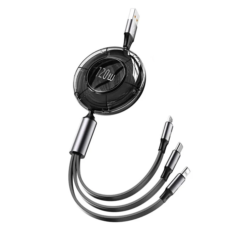 사양:재료ABS+PC+TPE+알루미늄 합금+점착제색깔검정/보라색케이블 길이35CM-120CM(인출식)전력/전류120W/6A입력 인터페이스USB-A출력 인터페이스iP/Micro/Type-C데이터 전송Type-C만 지원호환되는 장치스마트폰, 태블릿, 노트북특징: 1. 다용도 호환성: 스마트폰, 태블릿 및 노트북과 호환되어 하나의 케이블로 여러 기기를 충전할 수 있습니다.2. 출입이 가능한 케이블: 케이블 길이를 35cm에서 120cm 사이로 조절하여 다양한 상황에 유연성과 편의성을 제공합니다.강력한 충전: 120W의 전력 출력과 6A의 전류로 장치를 빠르고 효율적으로 충전합니다.4. 다중 출력 인터페이스: iP, Micro 및 Type-C 출력 인터페이스를 지원하여 다양한 장치에 연결할 수 있습니다.5. 데이터 전송 : Type-C 인터페이스는 데이터 전송을 지원하여 파일을 전송하고 기기를 동기화할 수 있습니다.패키지에 포함되어 있는 것:1x 케이블