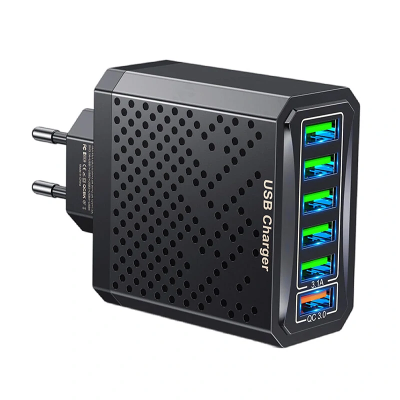 사양:재료PC 화재 방지 물질인터페이스6USB-A입력AC100-240V 50/60HZ 0.5A출력QC3.0: 5V=3.0A 9V=2.0A 12V=1.5A5V/3.1A= USB1+USB2+USB3+USB4+USB5단일 포트 최대 2.4A)특징: 고품질 소재 : PC 난연성 재질로 제작되어 안전성과 내구성을 보장합니다.2. 다중 USB 포트: 6개의 USB-A 포트로 여러 기기를 동시에 충전할 수 있어 편리합니다.3. 퀵 차지 3.0 : QC3.0 기술을 채용하여 빠르고 효율적인 충전이 가능합니다.4. 유니버설 호환성: 다양한 기기와 호환되며 다양한 입력 전압을 지원합니다.5. 스마트 충전: 각 포트는 최대 출력 2.4A를 갖추어 각 연결된 장치의 최적 충전 속도를 보장합니다.포함된 패키지:1x 6포트 USB 충전기
