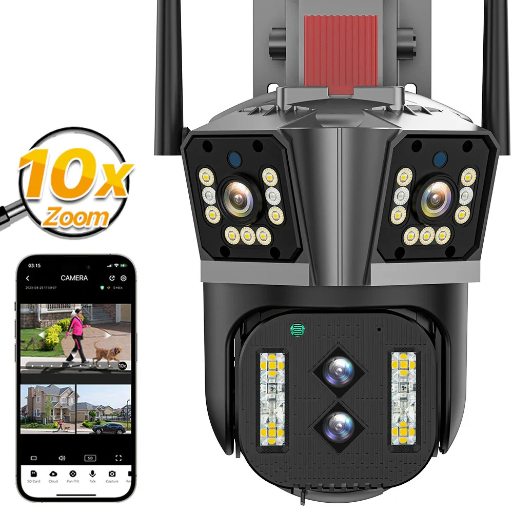 Specifications Lenses Four lensesSensors Four sensorsCamera Resolution 8K 4MP per lens four lenses Zoom Ultra wide angle 10x hybrrid zoomAntenna High gain enhanced 5dBi antennaImage Modes Smart mode infrared mode color modeWiFi Compatibility Supports 2 4GHz WiFi does not support 5G WiFi Network Connection RJ 45 network cable connectionMotion Detection 24 7 motion detection with real time push notificationsAudio Built in high quality speakers and microphones for two way conversationsVoice Enhancement Echo suppression cancellation and noise suppression technologyImage Transmission Real time image transmission with adaptive networkFeatures 1 Four LensesFour SensorsThree Screens The camera s innovative design features four lenses four sensors and three screens allowing you to capture and monitor more details providing enhanced visual clarity 2 8K Resolution The 8K camera achieves clear monitoring of both far and near distances with its ultra wide angle and 10x hybrrid zoom capability 3 Infrared and Color Modes The camera offers three image modes smart mode infrared mode and color mode Infrared mode provides black and white images with the infrared LEDs activated while color mode displays vibrant and colorful day night vision with the white LED 4 Human Motion Detection and Real time Push Notifications The camera features 24 7 motion detection ensuring constant surveillance and immediate real time push notifications to protect your family