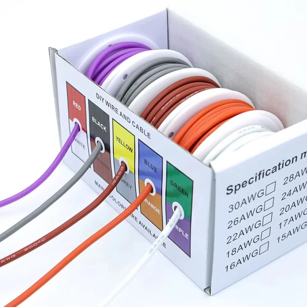 Spécifications:- Modèle : Fil en silicone doux haute température- Tension nominale : 600 V- Plage de température : -60°C à +200°C- Isolation : Silicone flexible et respectueux de l'environnement- Matériau du conducteur : Fil de cuivre étamé- Plage de tailles : 18/20/22/24 AWG- Type de conducteur : Fil de cuivre toronné- Applications : RC,télécommande,batteries à nouvelle énergie,diverses connexions électroniques,etc. - Couleur: Blanc/Marron/Gris/Orange/Violet- Longueur : Longueur totale de 25 mètres (5 mètres de chaque couleur) 18AWG:Diamètre extérieur du fil : 2.3mmCœur transversal : 0,75 mm² 20AWG:Diamètre extérieur du fil : 1.8mmCâble central : 0.5mm² 22AWG:Diamètre extérieur du fil : 1,7 mmCœur transversal : 0.3mm² 24AWG:Diamètre extérieur du fil : 1,6 mmNoyau transversal : 0.2mm² Fonctionnalités:1. Résistance à haute température : résiste à des températures de -60 °C à +200 °C, ce qui le rend idéal pour des environnements à forte demande.2. Isolation écologique : dispose d'une gaine en silicone flexible qui est sûre pour l'environnement et offre une excellente isolation.3. Matériau conducteur polyvalent : Le fil de cuivre étamé torsadé garantit une excellente conductivité électrique et une résistance à la corrosion.4. Applications multiples : Convient pour RC, contrôle à distance, nouvelles batteries énergétiques et diverses connexions électroniques, offrant une large utilité.5. Emballage multi-couleur pratique : disponible en cinq couleurs vives (rouge,noir,jaune,bleu,v