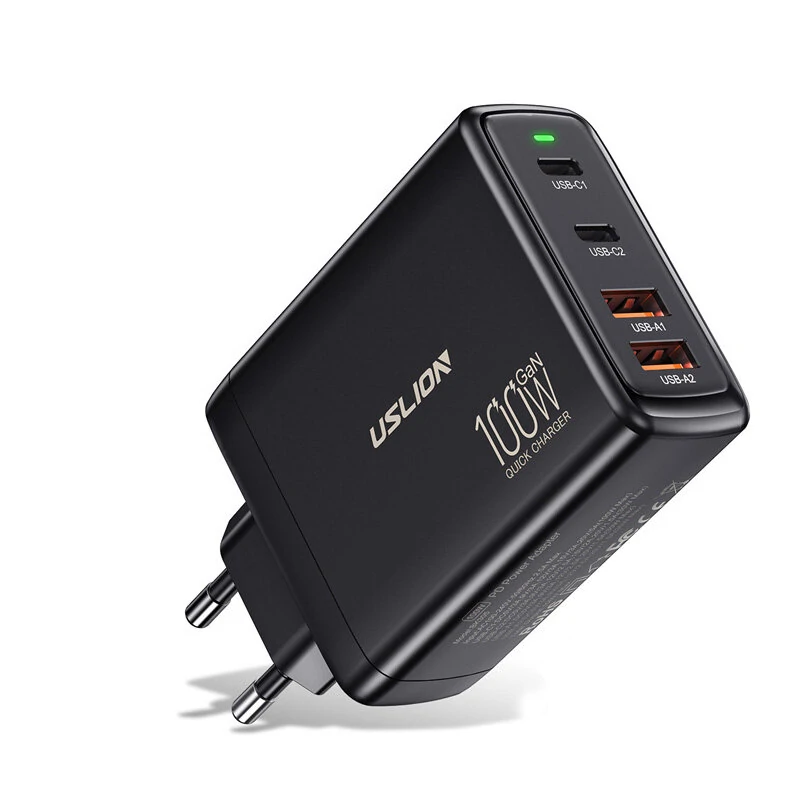 Spécifications:Product name: 100W 4-Port USB PD Charger Marque: USLIONCouleur: Noir/BlancMatériau : PCSize: 114*62*30mmInterface: 2USB-A+2USB-CInput: AC100-240V-50/60Hz 2.5A MaxOutput: USB-C1:DC5V/3A,9V/3A,12V/3A,15V/3A,20V/5A(100W Max)USB-C2:DC5V/3A,9V/3A,12V/2.5A,15V/2A,20V/1.5A(30W Max)USB-A1: DC5V/3A,9V/2A,12V/1.5A(18W Max)USB-A2: DC5V/3A,9V/2A,12V/1.5A(18W Max)Protocols: QC3.0 PD3.0 SCP FCP PPS Type: EU Plug/US PlugPuissance : 100WFonctionnalités:1. High Power Output: The USLION 100W 4-Port USB PD Charger is equipped with a robust power delivery system, allowing it to deliver up to 100W of power for fast charging. It can charge laptops, smartphones, tablets, and other devices quickly and efficiently.2. Multiple Ports: With two USB-A ports and two USB-C ports, this charger offers versatility for charging multiple devices simultaneously. You can charge your smartphone, laptop, tablet, and other gadgets all at once.3. Wide Compatibility: This charger is compatible with a variety of devices, including the latest smartphones like for iPhone 15, 15 Plus, 15 Pro, Huawei Mate60 Pro, Samsung Galaxy S23, and Xiaomi 13 Pro. It supports multiple charging protocols, ensuring broad device compatibility.4. GaN Tech: The charger utilizes GaN (Gallium Nitride) technology, which allows for a more compact and efficient design. GaN chargers are smaller and generate less heat while maintaining high power output.5. Safety Fonctionnalités: The charger incorporates multiple safety features, inc