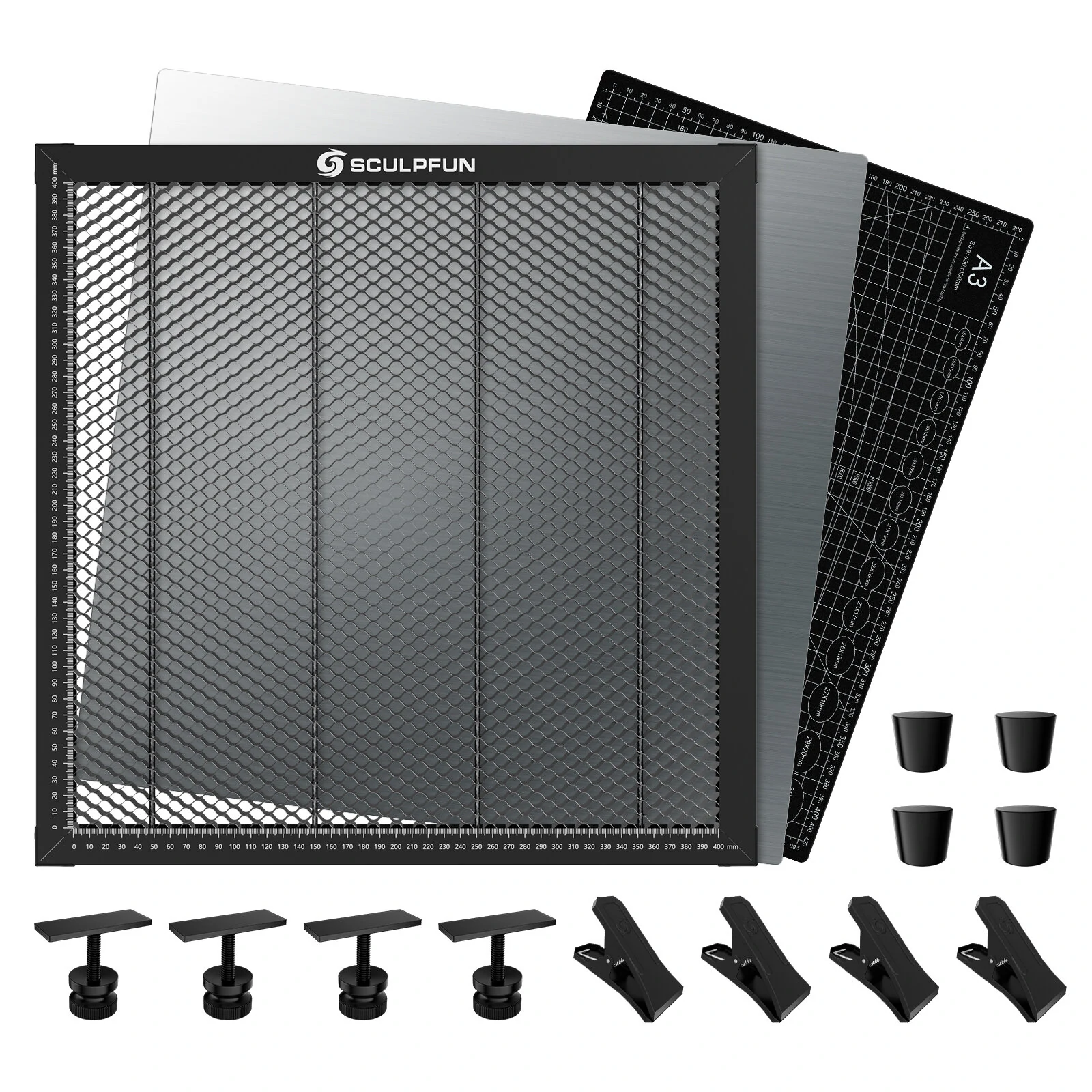 الميزة الرئيسية:1. الاكسسوارات الضرورية لقطع الليزر: بعد استخدام محظة قطع الليزر لقطع الخشب والاكريليك ومواد أخرى، تكون حواف الخشب مرتبة ونظيفة، ولا يسهل أصفرارها بواسطة الدخان، ويمكن الحصول على عمل قطع نظيف.2. منطقة عسلية قياسية بمساحة 400 × 400 مم: المنطقة الخارجية 450 × 450 مم، ومساحة العمل في المنطقة العسلية 400 × 400 مم، مما يوفر لك مساحة استخدام أكثر فعالية.3. مشابك معدنية محترفة: يوفر SCULPFUN لوحة العسل مشابك معدنية مصممة بشكل فريد، بما في ذلك مشابك معدنية عالية القوة ومشابك بشكل حرف T، التي يمكن أن تثبت بسهولة الأخشاب المنحنية أو حتى الألواح المعدنية للحفاظ على سطح النقش مستوياً.4. تصميم مراقبة للقطع: تحتوي لوحة العسل SCULPFUN على تصميم مراقبة قطع مريح جدًا. عندما يقوم الليزر بقطع الخشب أو الاكريليك، ستصدر اللوحة المعدنية الخلفية للوحة العسل ضوءًا ساطعًا، مما يعني أن القطع قد اخترق. يحل المشكلة التي يصعب على الآلات النقش العادية تحديد ما إذا كانت القطعة قد اخترقت أم لا.5. حامي مكتب معدني آمن: تحتوي لوحة العسل SCULPFUN على لوحة حماية مكتب معدنية يمكن أن تحمي الطاولة من الضرر الناتج عن الليزر، مما يجعلها مناسبة جدًا لليزرات الصغيرة للقيام بتجارب DIY.6. لوحة قطع متعددة الوظائف مجانًا: تقدم لوحة قياس متعددة الوظائف مجانًا، والتي يمكن استخدامها كحصيرة قطع يدوية بوظيفة إصلاح تلقائي، ويمكن أيضًا قياس حجم أجزاء مختلفة مصنوعة يدويًا.7. تصميم أفضل لسرير القطع بالليزر: مصنوع من ألواح العسل الفولاذية فائقة الرقة بسمك 0.2 مم، مع مراعاة التسطيح والصلابة والكثافة. في المقارنات بين القطع، يتفوق سرير العسل على تصاميم قماش القطع الأخرى مثل سرير السكاكين أو سرير الأظافر.8. مسطرة قياس ز