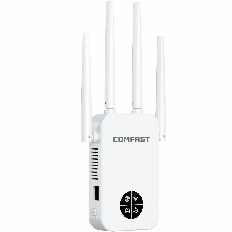 المواصفات:علامة تجاريةCOMFASTالنموذجCF-WR762ACالمعيار اللاسلكي802.11b/g/n: 2.412GHz-2.472GHz802.11ax/ac/an/a: 5.180GHz-5.825GHzالمعايير المدعومةIEEE802.11a/b/g/n/acمعدل الإرسال2.4GHz: 300Mbps; 5.8GHz: 867Mbpsزر1 زر WPS/RSTعرضWPS / منفذ RJ45 / واي فاي / حالة الشبكةواجهة فيزيائية1*10/100Mbps منفذ إيثرنت WAN RJ45وضع العملوضع نقطة الوصول/المكرر/الموجهأبعاد197*62*45mmبيئة العملدرجة الحرارة التشغيلية: 0℃~40℃درجة حرارة التخزين:-40℃~70℃معدل الرطوبة التشغيلية: 10%~90%RH غير متكثفرطوبة التخزين: 5٪ ~ 90٪ رطوبة نسبية غير تكثفالميزات: 1. الاتصال عالي السرعة: يدعم معدلات نقل تصل إلى 1200Mbps لاستخدام الإنترنت بسلاسة.2. تشغيل مزدوج النطاق: يعمل على كلا النطاقين 2.4GHz (300Mbps) و 5.8GHz (867Mbps) من أجل اتصالات مستقرة.3. عرض الشاشة الذكي: قم بعرض ورصد حالة WPS، ومنفذ RJ45، وWi-Fi، والشبكة بسهولة من خلال عرض الشاشة الذكي.4. أربع هوائيات خارجية: مزودة بأربع هوائيات متعددة الاتجاهات عالية الكسب لتغطية أوسع وأكثر فعالية.5. أوضاع تشغيل متعددة: تعمل كنقطة وصول (AP) أو مكرر أو موجه لتلبية احتياجات الشبكة المختلفة.6. زر WPS: إعداد بسيط وسريع بضغطة على زر WPS للراحة.تتضمن الحزمة:1x Repeater1x كابل الشبكة1x تعليمات