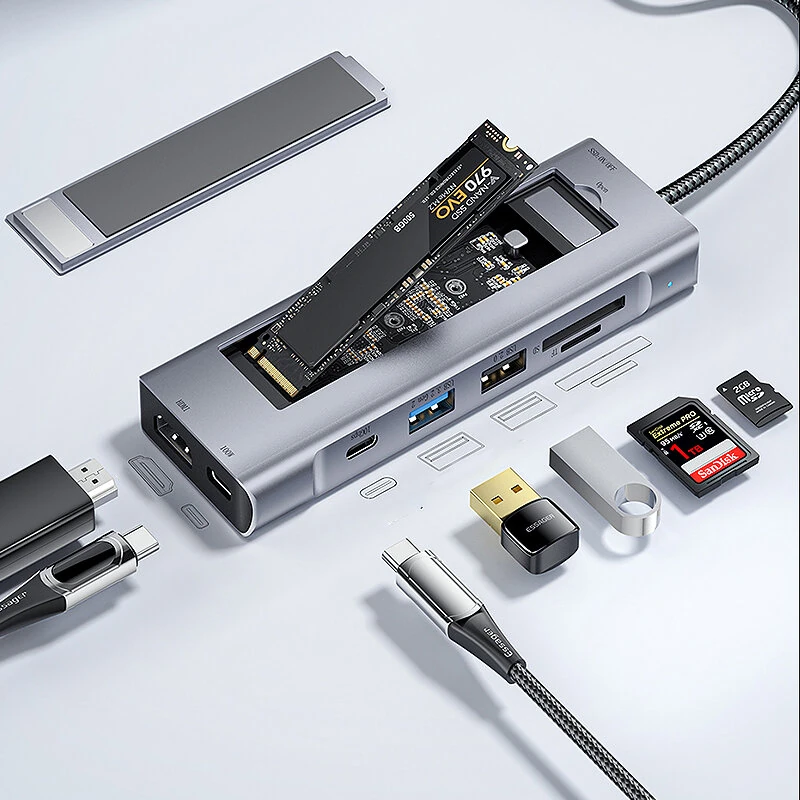 사양: 제품 유형8 IN 1 타입-C 도킹 스테이션색깔회색재료알루미늄 합금+ABS입력 인터페이스타입-C출력 인터페이스USB2.0*1USB3.2Gen 2*110Gbps USB-C 데이터*1PD100W USB-C*14K@30Hz HD*1SD 카드 리더 슬롯*1TF 카드 리더 슬롯 *1*1 M.2 카드 슬롯전송률10Gbps크기134*46.15*14mm무게104g케이블 길이176mm특징:1. 다재다능한 연결성: 8 IN 1 타입-C 도킹 스테이션은 장치 기능을 확장하기 위한 다양한 연결 옵션을 제공합니다. USB2.0, USB3.2Gen 2, USB-C 데이터, PD100W USB-C, HD, SD 카드 리더기, TF 카드 리더기 및 M.2 카드 슬롯을 통해 다양한 주변 장치와 장치를 쉽게 연결할 수 있습니다. 2. 고속 데이터 전송: 10Gbps의 전송 속도로 USB 드라이브나 SSD와 같은 외부 저장 장치를 연결할 때 빠른 데이터 전송과 효율적인 성능을 즐길 수 있습니다. 큰 파일, 비디오, 사진을 쉽게 전송할 수 있습니다.3. PD100W USB-C 전원 공급: 도킹 스테이션에는 PD100W USB-C 포트가 있어 호환되는 장치를 빠르고 효율적으로 충전할 수 있습니다. 여러 주변 기기를 동시에 사용하면서 배터리 부족에 대한 걱정을 이제 고별할 수 있습니다.4. 4K@30Hz HD 출력: 4K@30Hz HD 포트를 사용하여 장치를 외부 디스플레이 또는 모니터에 연결하세요. 고해상도 지원으로 선명하고 생생한 비주얼을 즐기며,시청 또는 프레젠테이션 경험을 향상시킵니다.5. 편리한 카드 리더 슬롯: SD 카드 리더 및 TF 카드 리더 슬롯을 통해 메모리 카드에서 직접 데이터에 액세스하고 전송할 수 있습니다. 사진 작가, 비디오그래퍼 또는 멀티미디어 파일 작업자에게 완벽합니다.6. M.2 카드 슬롯: M.2 카드 슬롯은 기기에 추가적인 저장 확장 옵션을 제공합니다. 더 많은 저장 용량과 빠른 데이터 액세스 속도를 위해 M.2 SSD를 설치하세요.포함된 패키지:도킹 하드 디스크 박스 *1열전도 실리카 젤 *1스크류 드라이버 *1*1 나사너트 구리 기둥 *1지침 *1보증카드 *1
