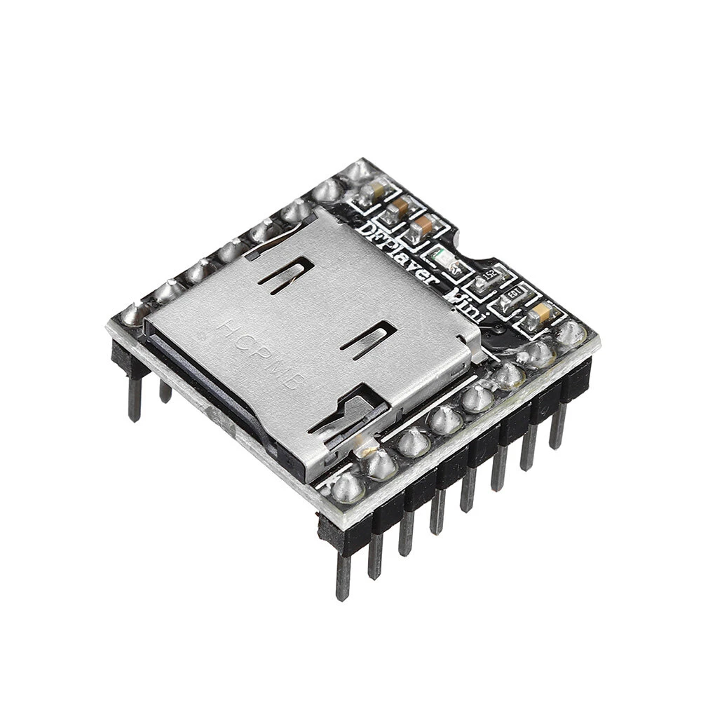 Recursos:O DFPlayer Mini é um módulo compacto e barato que pode ser conectado diretamente ao alto-falante. O módulo pode ser usado sozinho com alimentação de bateria, alto-falante e teclado, ou ser controlado através da porta serial, como o ArduinoUNO ou qualquer microcontrolador com uma porta serial. O próprio módulo integra perfeitamente o hardware de decodificação de arquivos MP3, WAV, WMA. Enquanto o software suporta o driver do cartão TF para suportar o sistema de arquivos FAT16, FAT32. Pode ser realizado por meio de um simples comando serial que reproduz a música especificada, bem como outras funções, sem operações tediosas de baixo nível, fácil de usar, estável e confiável.Especificações técnicas:1. Suporta taxas de amostragem (KHz): 8 / 11.025 / 12/16 / 22.05 / 24/32 / 44.1 / 482. Saída do DAC de 24 bits, suporte de faixa dinâmica: 90dB, suporte de SNR: 85dB3. Suporta totalmente o sistema de arquivos FAT16, FAT32, suporte máximo de cartão TF 32G, suporta disco U até 32G, 64M bytes de NORFLASH4. Vários modos de controle estão disponíveis. Modo de controle IO, modo serial, modo de controle por tecla AD5. A função de pontos de idiomas transmitidos permite parar a reprodução da música de fundo. Quando a propaganda terminar, o som de fundo continuará a ser reproduzido.6. Os dados de áudio são classificados por pasta, suportando até 100 pastas, as pastas podem atribuir a cada 255 faixas7. Volume ajustável em 30 níveis, EQ ajustável 6Aplicativo:1. Anúncio de voz de navegação
