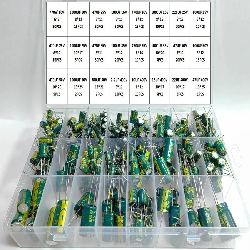 Funcionalidade:Tipo470uf1000UF47UF100UF470UF1000UF220UF100UFTamanho6*78*125*118*128*168*166*126*12Voltagem10V10V25V16V16V16V25V25VQTD.30PCS15PCS30PCS30PCS15PCS10PCS20PCS20PCSTipo470uf1000UF47UF100UF470UF1000UF47UF100UFTamanho8*1210*175*116*128*1610*206*128*12Voltagem25V25V35V35V35V35V50V50VQTD.15PCS5PCS30PCS20PCS10PCS5PCS20PCS15PCSTipo470uf1000UF680UF2.2UF10UF15UF22UF47UFTamanho10*2013*2513*218*128*1210*1710*1716*25Voltagem50V50V400V400V400V400V400V400VQTD.5PCS2PCS2PCS15PCS10PCS5PCS5PCS1PCS O pacote inclui:1 x caixa de 335 peças Kit de capacitores eletrolíticos