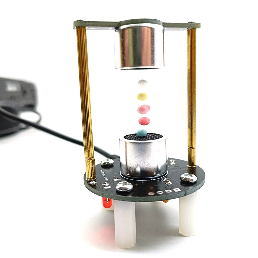 Özellikler:Güç Girişi: DC12V (0.5-1A)Fonksiyon: Ultrasonik süspansiyon, DIY elektronik yapmaBoyut: 44*40*66mmAğırlık: 22gBazı bileşenler değiştirilebilir, ancak bu kullanımı etkilemez. Gerçek alınan mallara dayanmaktadır.Not: Bu lehimlenmemiş bir üründür, kendiniz monte etmeniz gerekiyor.Kılavuz: Açmak için buraya tıklayınAçıklama:Bu levitator, havada 40 kHz frekansta çalışır ve köpük toplar, karıncalar ve diğer küçük nesneler gibi 2-3 mm çapında hafif nesneleri yakalayabilir. Uzun süre havada kararlı bir şekilde asılı kalabilir ve anakart hafifçe ısınır. Devre çoğunlukla bir mikrodenetleyici, bir sürücü entegresi ve 2 adet ultrasonik vericiden oluşur. Öncelikli olarak ultrasonik durma dalgası levitasyonu hakkında bilgi edinmek için kullanılır.Çalışma prensibi: Ultrasonik ayakta duran dalga levitasyonu,ultrasonik iletim ucunun ve iletim ucunun (veya başka bir iletim ucunun) arasındaki belli bir mesafe olduğu gerçeğine dayanır (rezonans boşluğu mesafesi denir). Yayınlanan dalga ve yansıyan dalga (veya başka bir ses dalgası) sürekli olarak birleşir ve nihayetinde bir duran dalga oluşturur. Duran dalganın düğüm noktasındaki nesne üzerindeki ses dalgası kuvveti yerçekimi etkisini aşar ve nihayetinde levitasyon etkisini elde eder.Nasıl oynanır: Küçük köpük topunu tutmak için cımbız kullanın, köpük topunu iki ultrasonik prob arasına nazikçe yerleştirin, ve köpük topu yüzeye çıkacaktır.Özellikler:1. Ultrasonik Süspansiyon: Bu DIY kiti, ultrasonik süspansiyonun etkileyici bir gösteri